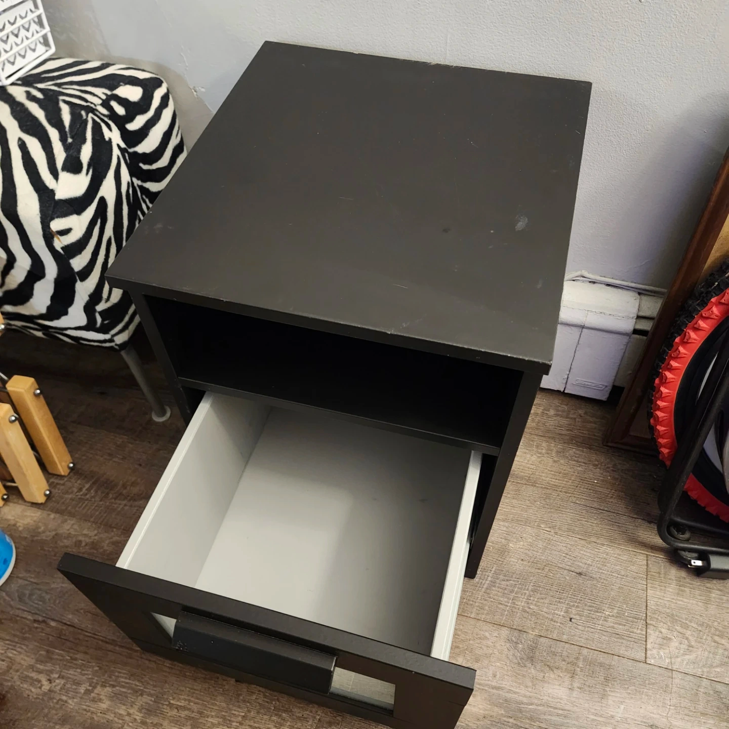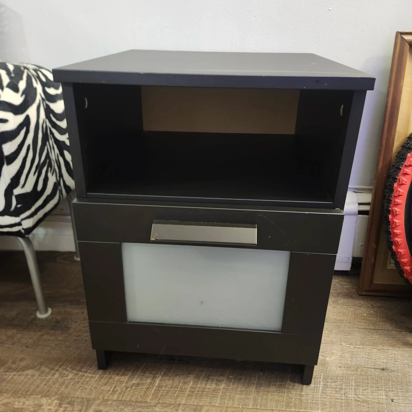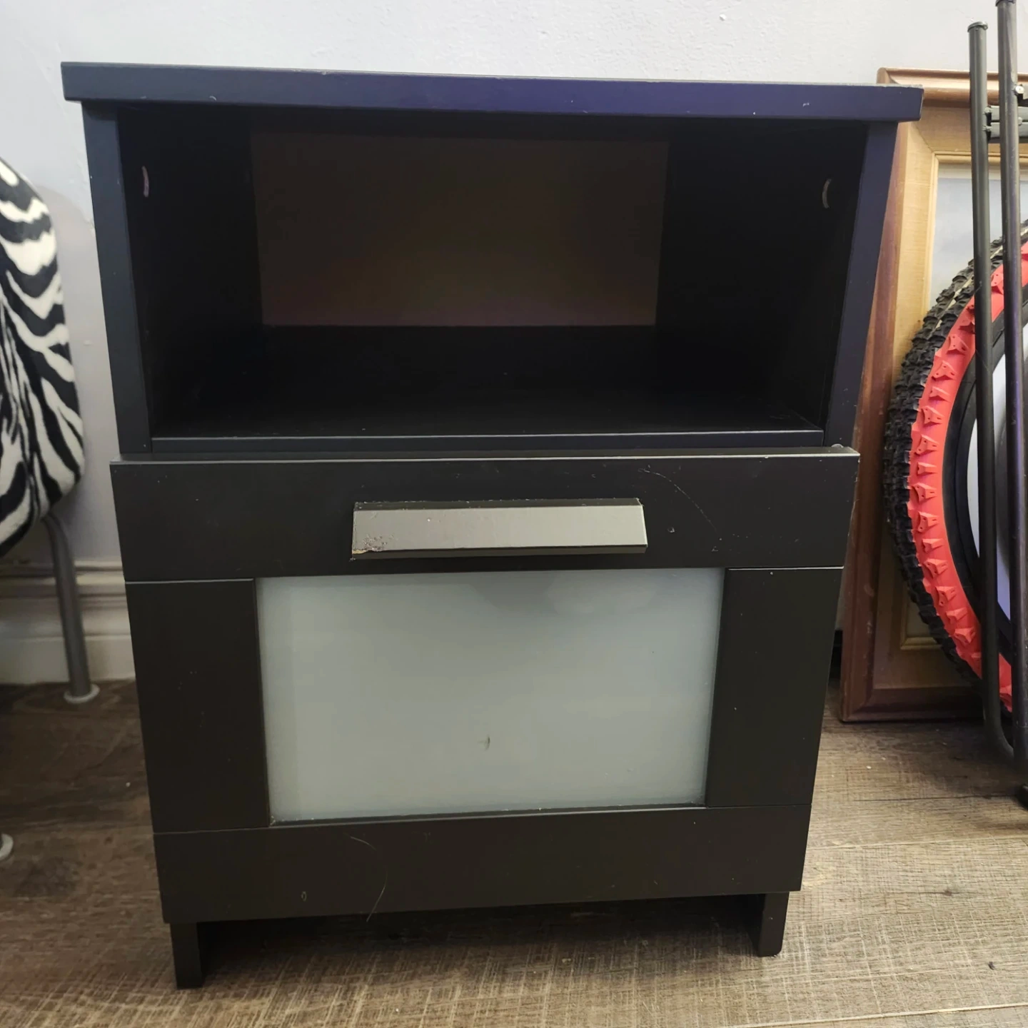 This black nightstand has a decent size drawer, and open shelf for extra storage. There's some minor marks on the top (as shown in photo), but overall in very good condition. Perfect for a bedside table or small storage unit.