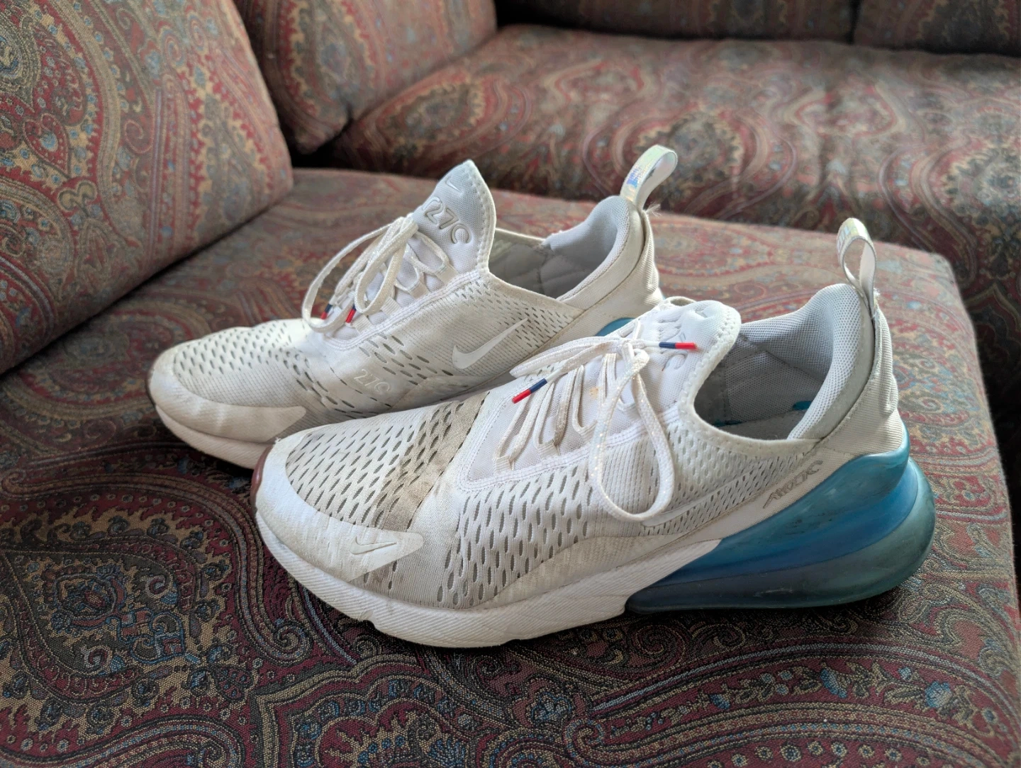 Selling a pair of Nike Air Max 270 sneakers in white. They are in used condition, as you can see in the pictures. The size is US 11.5.