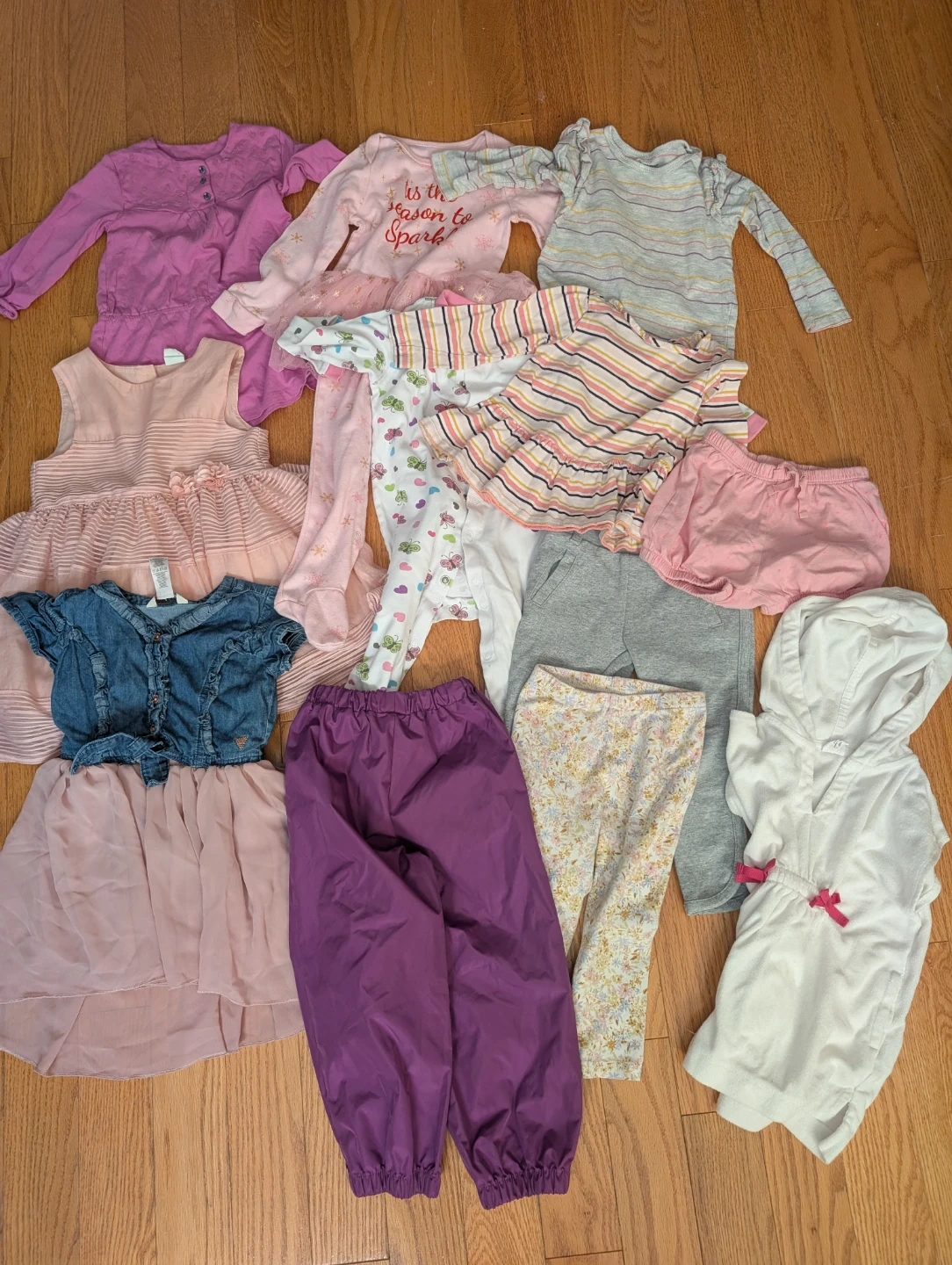 The bundle of girls' clothing includes dresses, tops, pants, and onesies. 12 items in the bundle, less than $1 per item!