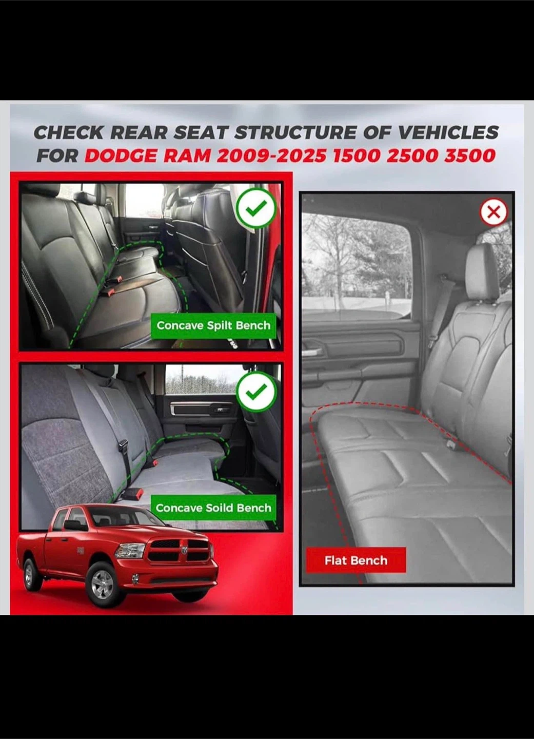 [Custom Fit] - Car seat covers are custom fit for Dodge Ram 2002-2025 1500 Classic & 2009-2025 2500 3500 crew cab quad cab truck pickup with curved rear seat, such as TRX, Limited, Limited Long horn, Rebel, Laramie, Big Horn, Tradesman, Power Wagon. (Just not for ram 19-24 1500 crew cab flat bench)