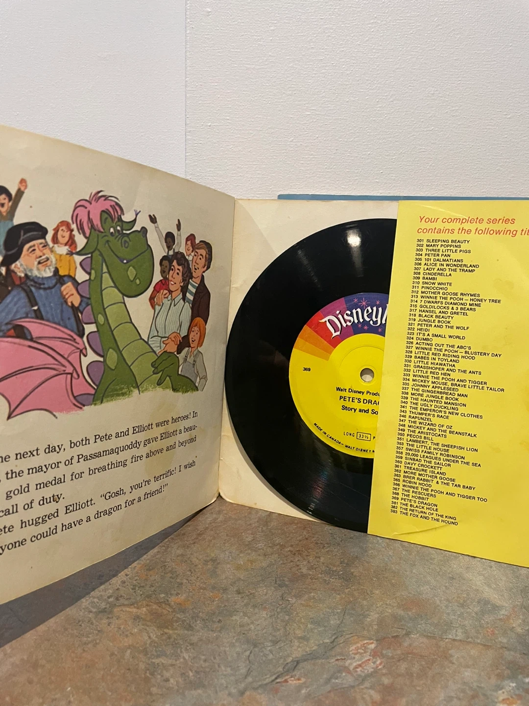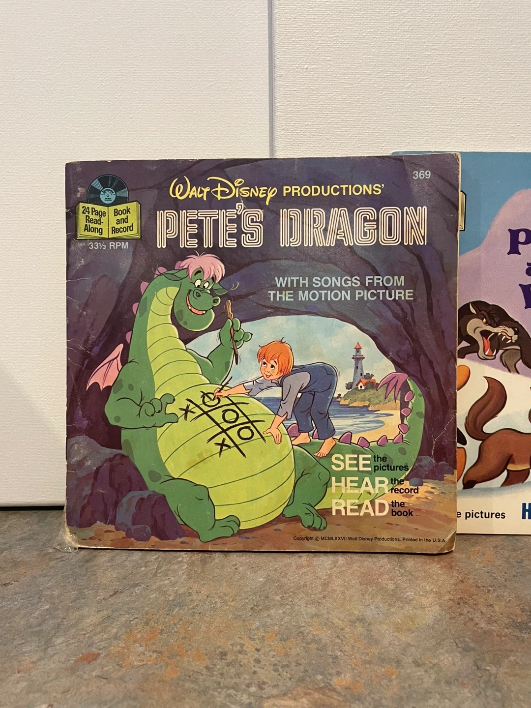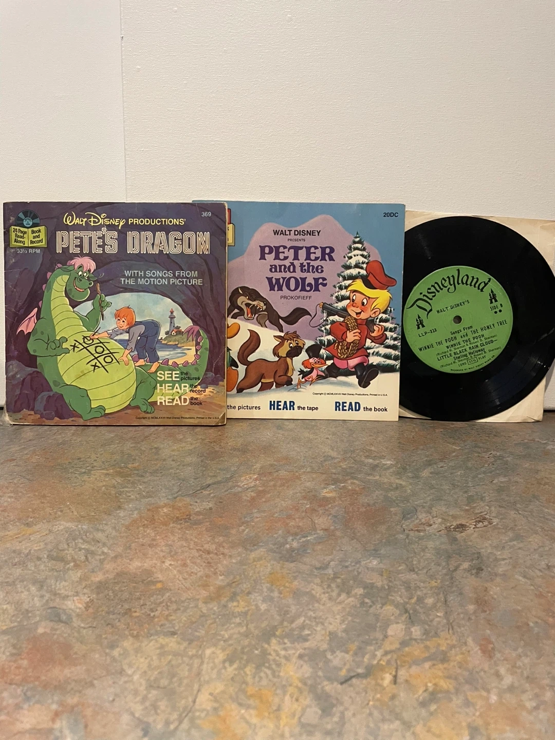 Vintage Walt Disney book and record Pete's Dragon, Peter and the Wolf (book only) and Winnie the Pooh (record only). Covers are worn, record and book are intact