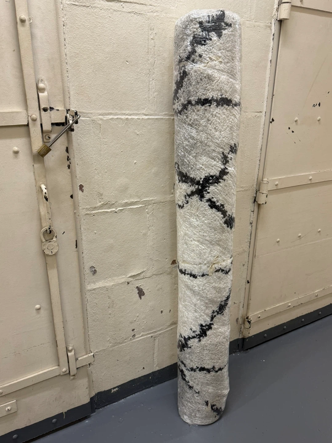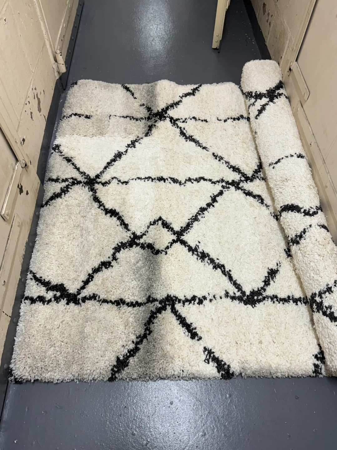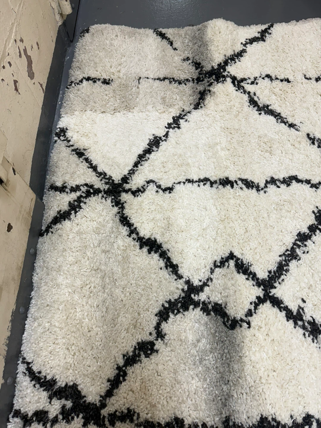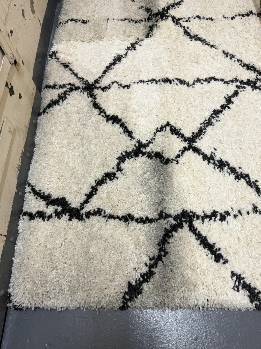 Selling a shag rug with an ivory and black geometric pattern. It's in good condition, except a quarter of it got really dirty. It will be brand new after being shampooed and steam cleaned.