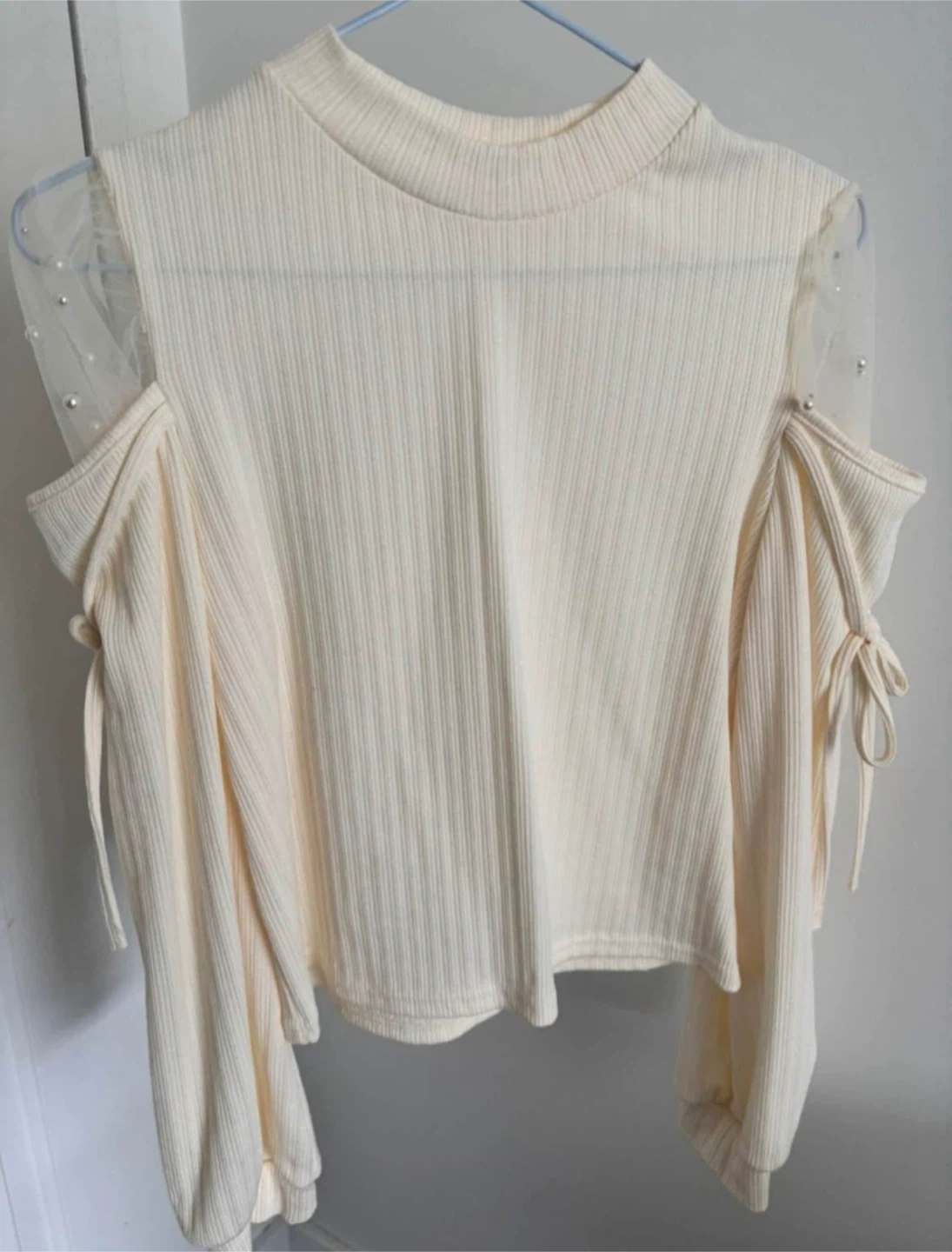 A cute cream-coloured ribbed knit top with unique details! It features a mock neck and long, balloon sleeves with shoulder cutouts. The sleeves also have sheer, pearl-embellished sections for a touch of elegance. Perfect for adding a stylish twist to your wardrobe!