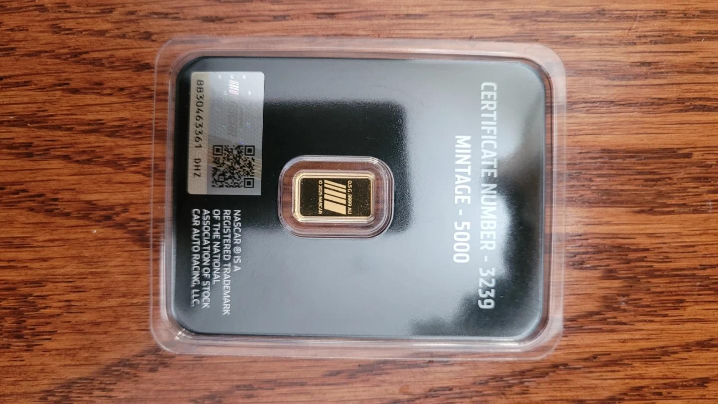 Selling a NASCAR Racing 0.5G Pure Gold Bar. Certificate number and the total mintage is 5000. It's in great condition and comes in its original packaging. Authenticity with hologram and qr code