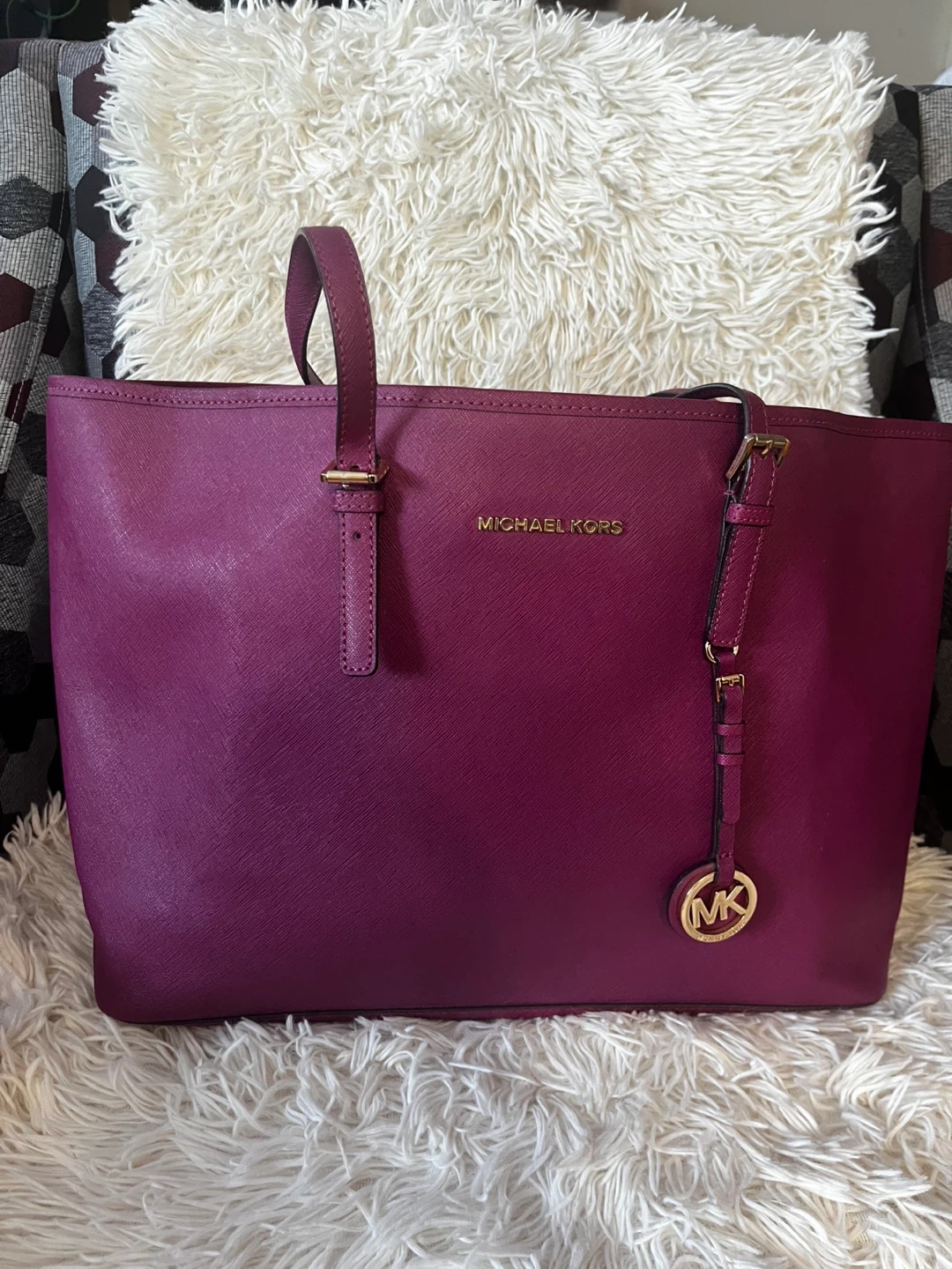 Selling a Michael Kors tote bag in a lovely plum colour. It's a stylish and practical bag for everyday use. There are some signs of wear, as shown in the photos, but it's still in good condition and has lots of life left!