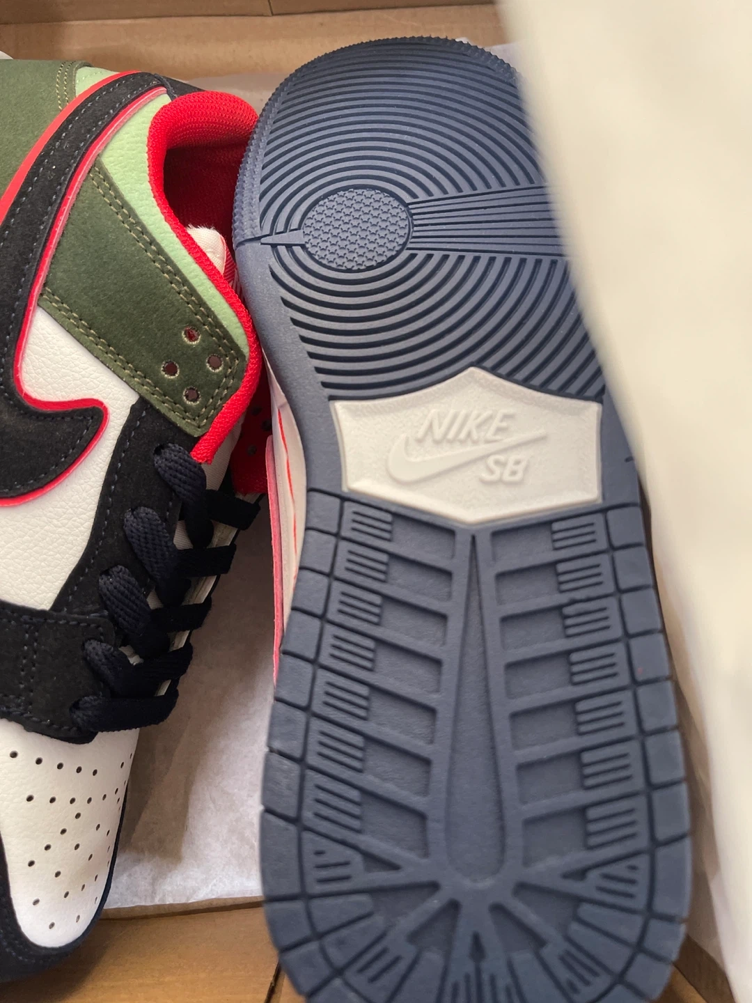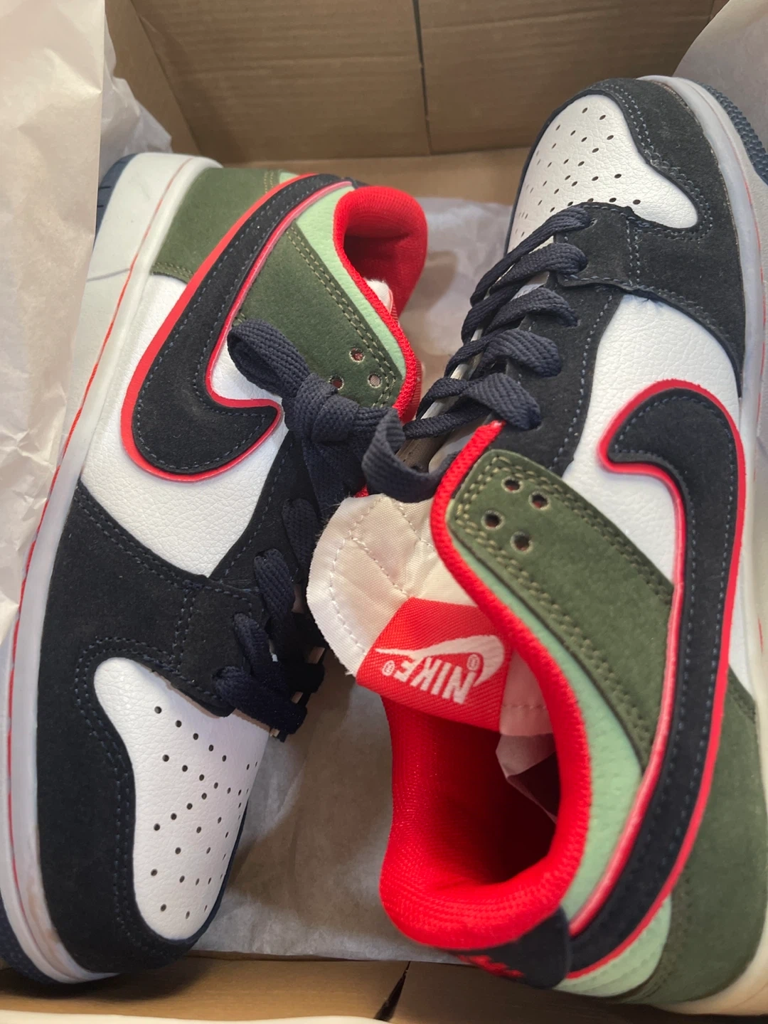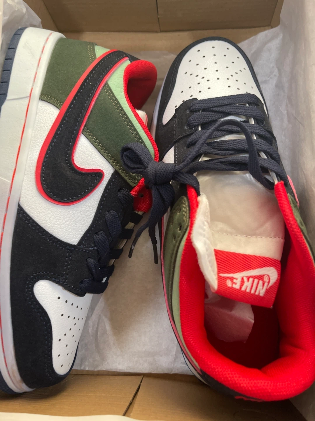 Selling a pair of Nike SB Dunk Low Pro sneakers in the "Chlorophyll" colorway. These are in great condition and come with the original box. The shoes feature a mix of materials and colors, including white, black, olive green, and red accents. A classic and stylish choice for any sneaker enthusiast!