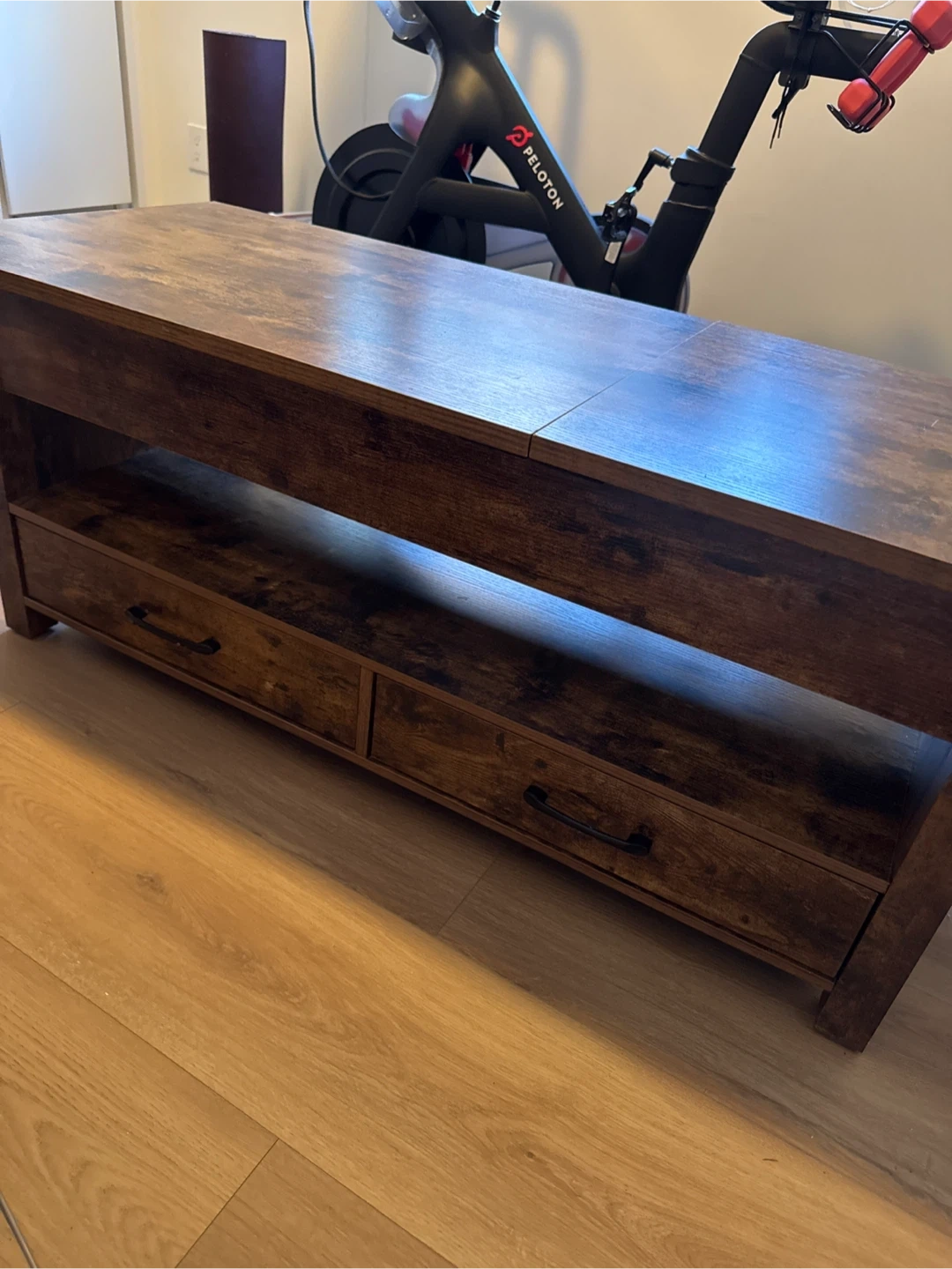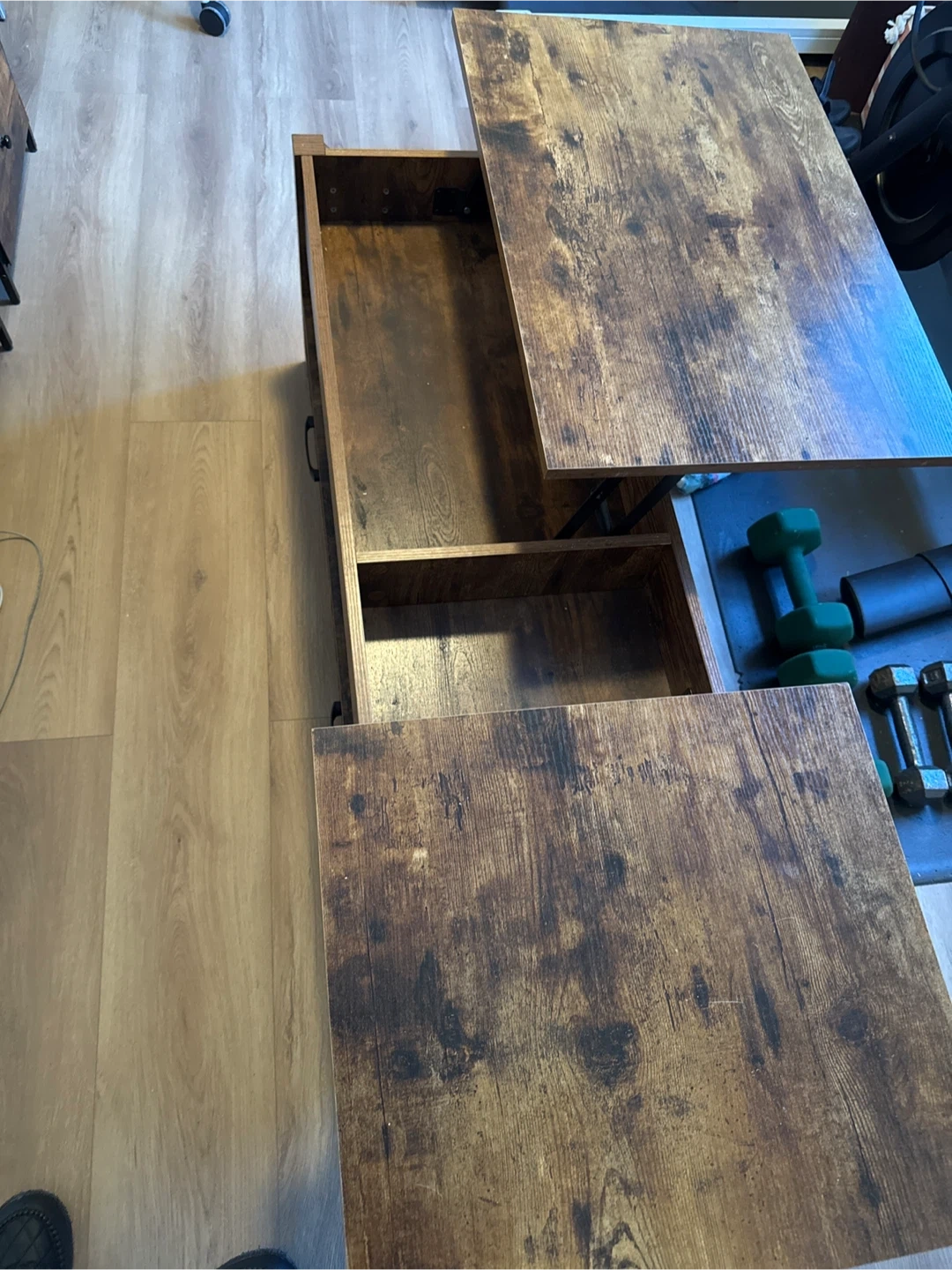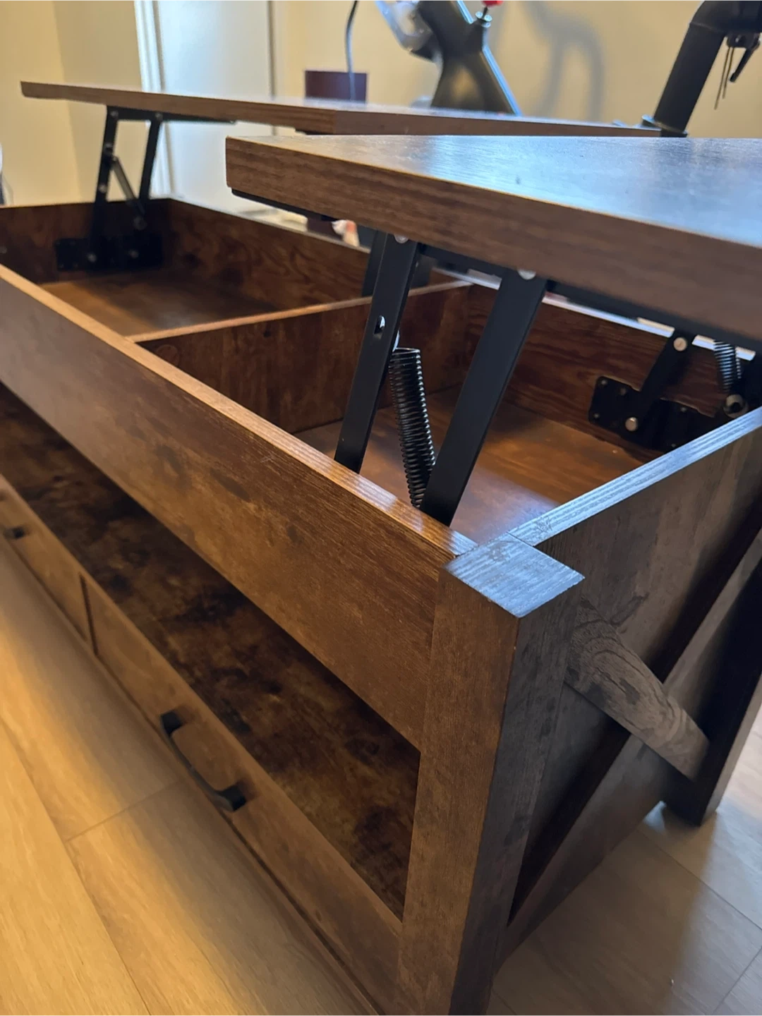 Selling a lift top coffee table in a rustic brown finish! It's in great shape and has a unique design that offers extra storage space.