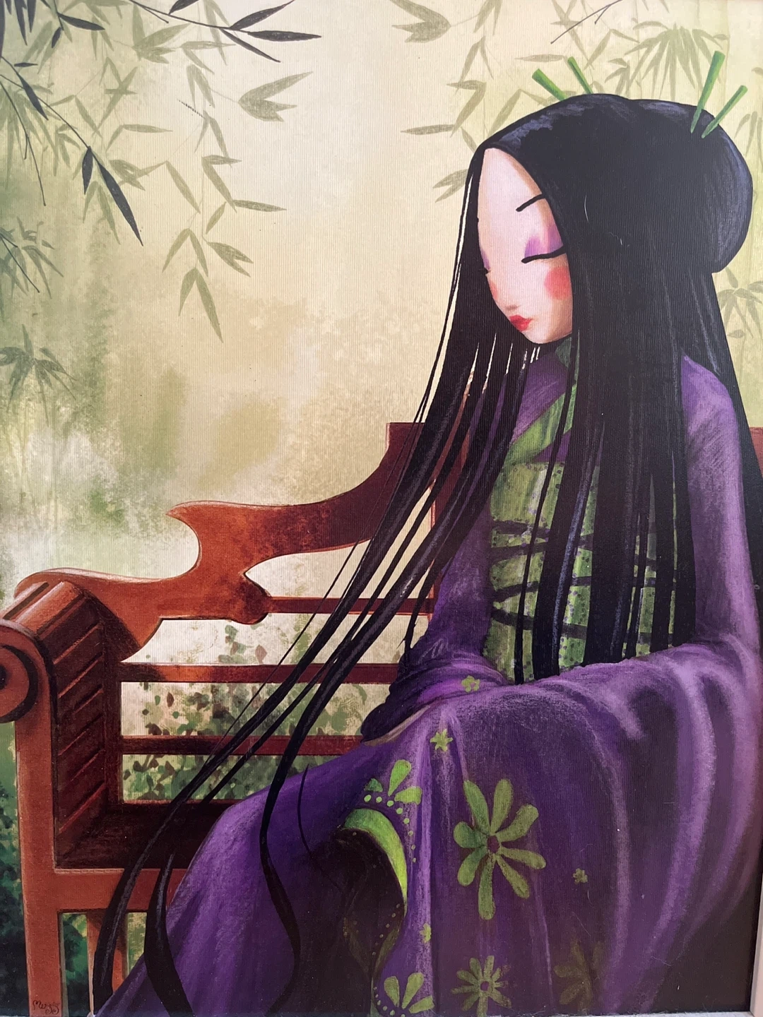 It features a woman with black hair sitting on a bench, surrounded by bamboo and greenery.