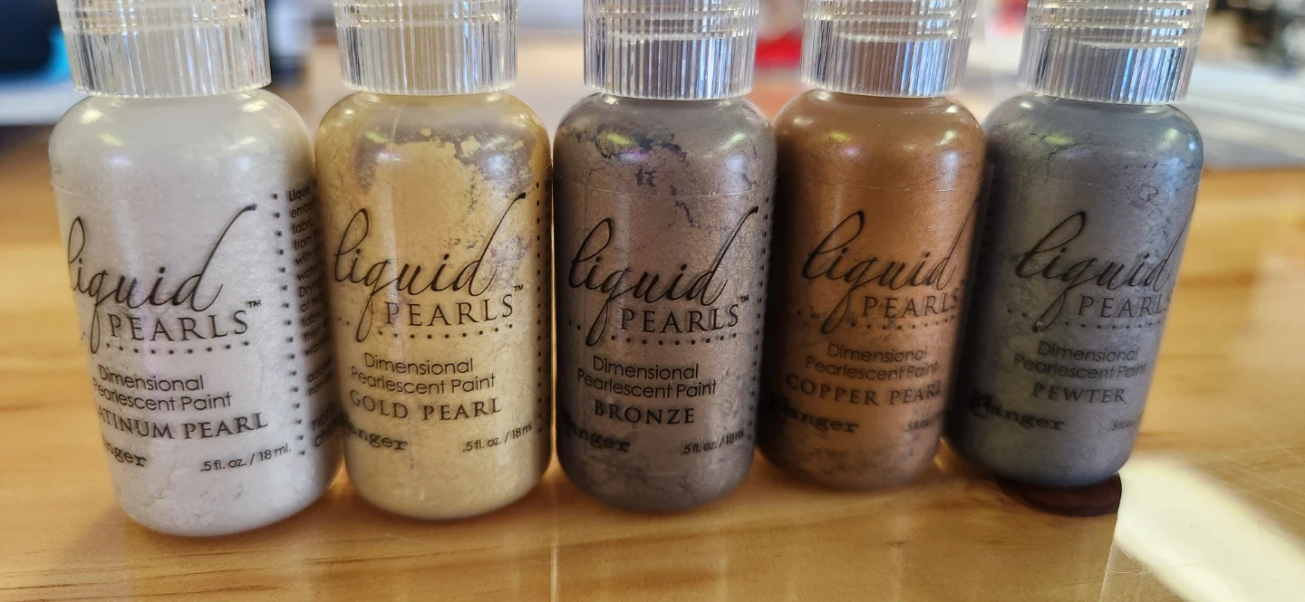 Selling a set of Liquid Pearls dimensional pearlescent paints! This set includes five different colours: Platinum Pearl, Gold Pearl, Bronze, Copper Pearl, and Pewter. Each bottle contains 0.5 fl oz / 18 ml of paint. Perfect for adding a pearlescent touch to your craft projects