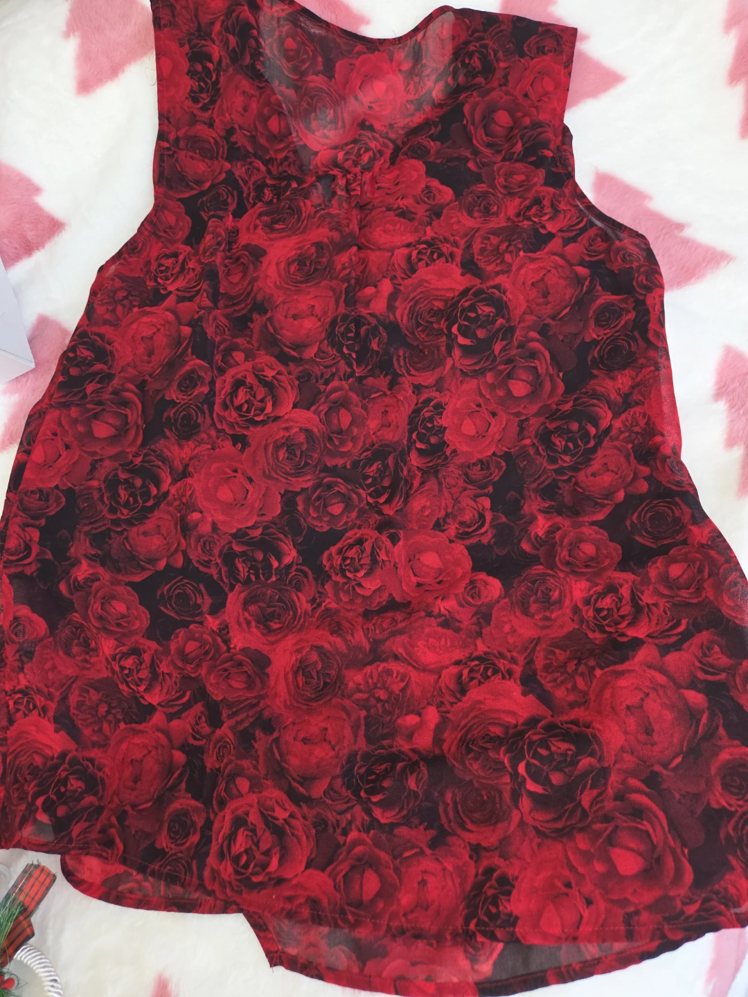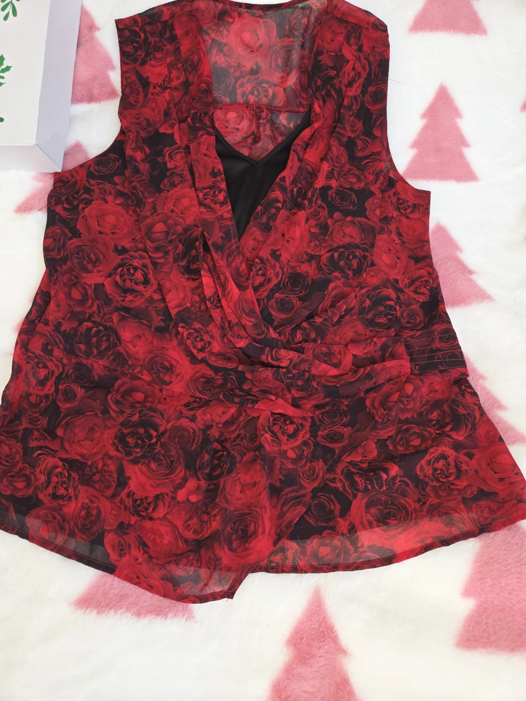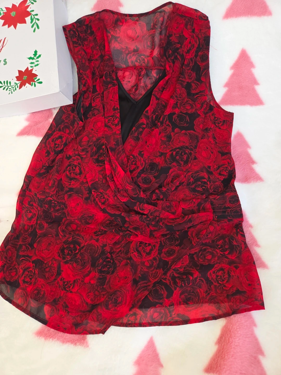 Here's a lovely sleeveless blouse with a vibrant red rose pattern! It features a stylish V-neck design and is perfect for adding a pop of colour to your wardrobe. It's in great condition and ready for a new home!