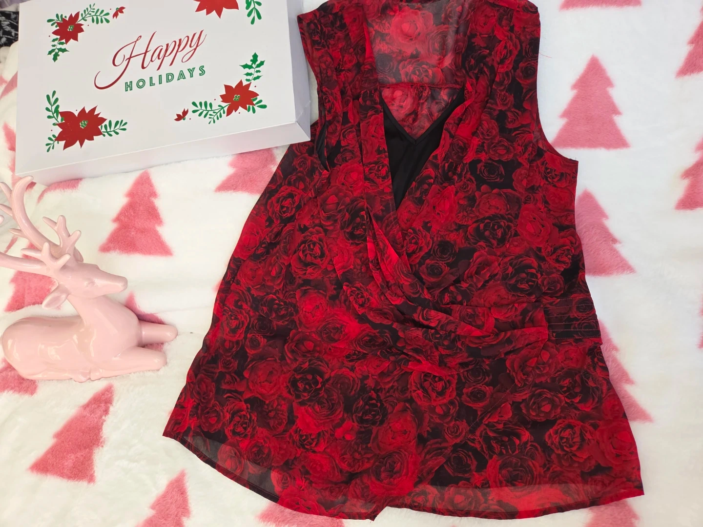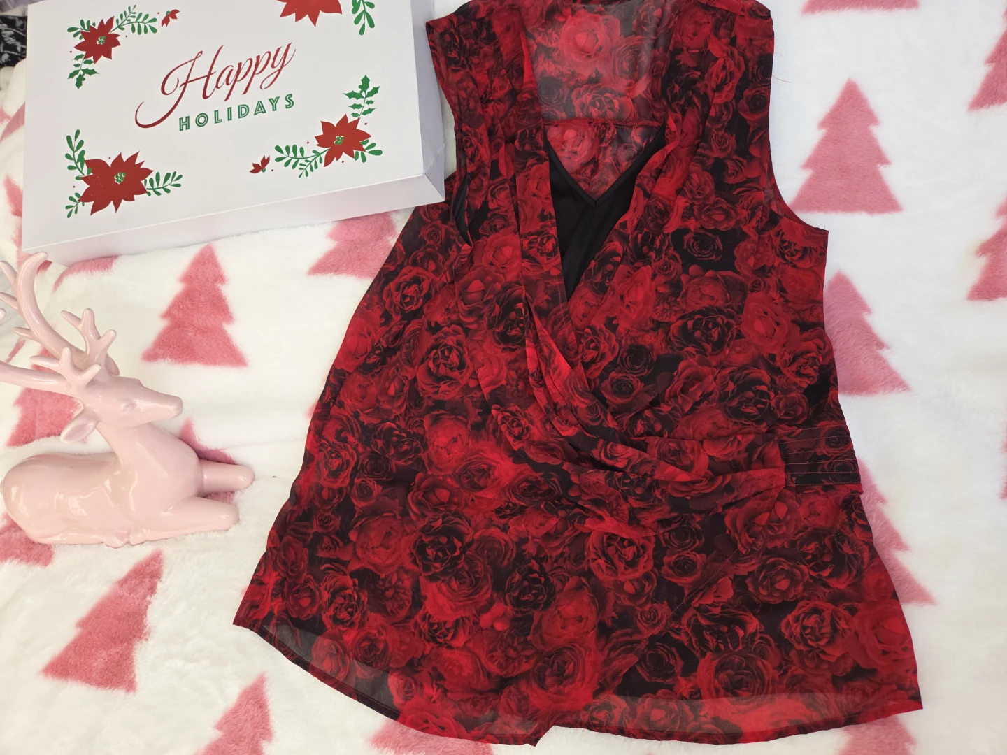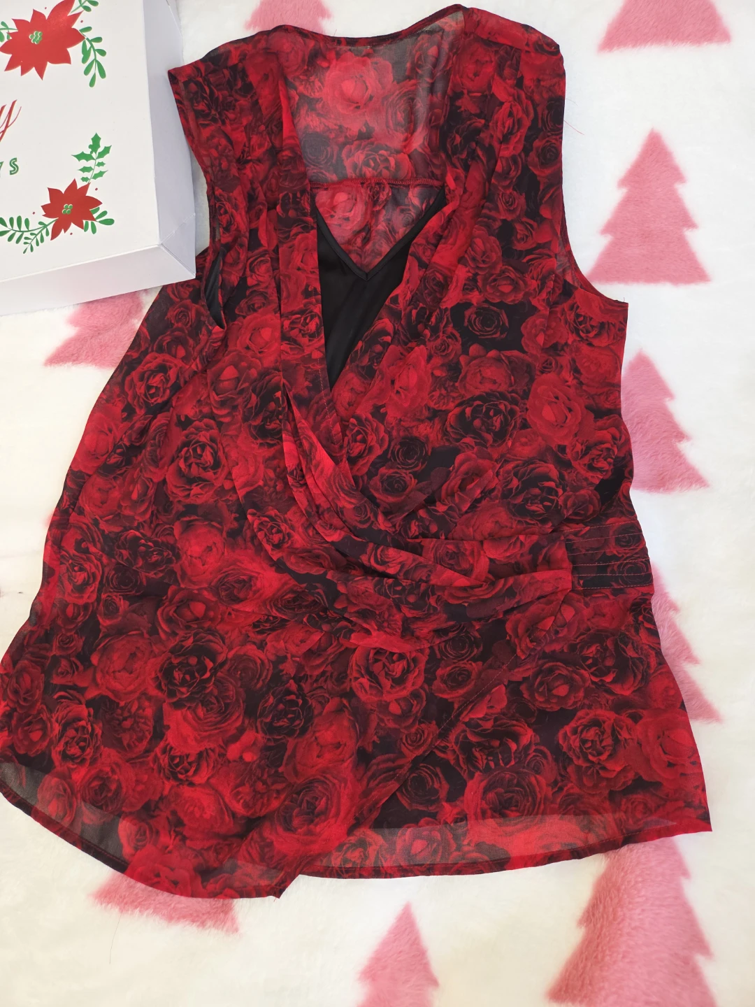 Here's a lovely sleeveless blouse with a vibrant red rose pattern! It features a stylish V-neck design and is perfect for adding a pop of colour to your wardrobe. It's in great condition and ready for a new home!