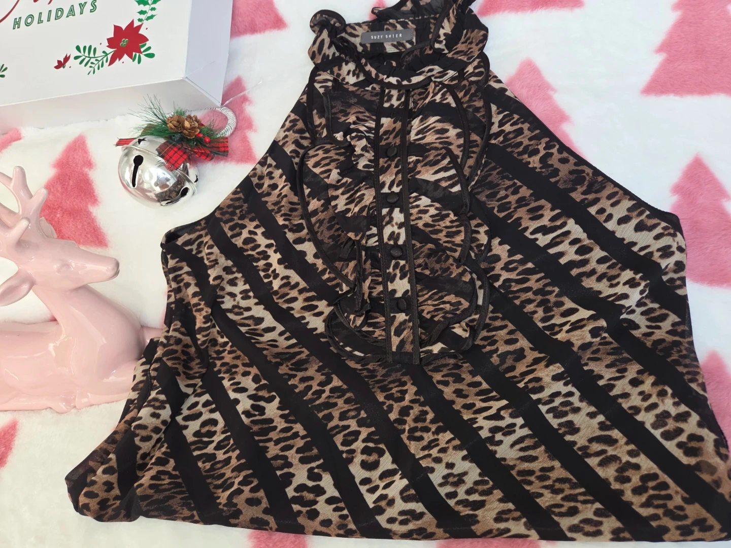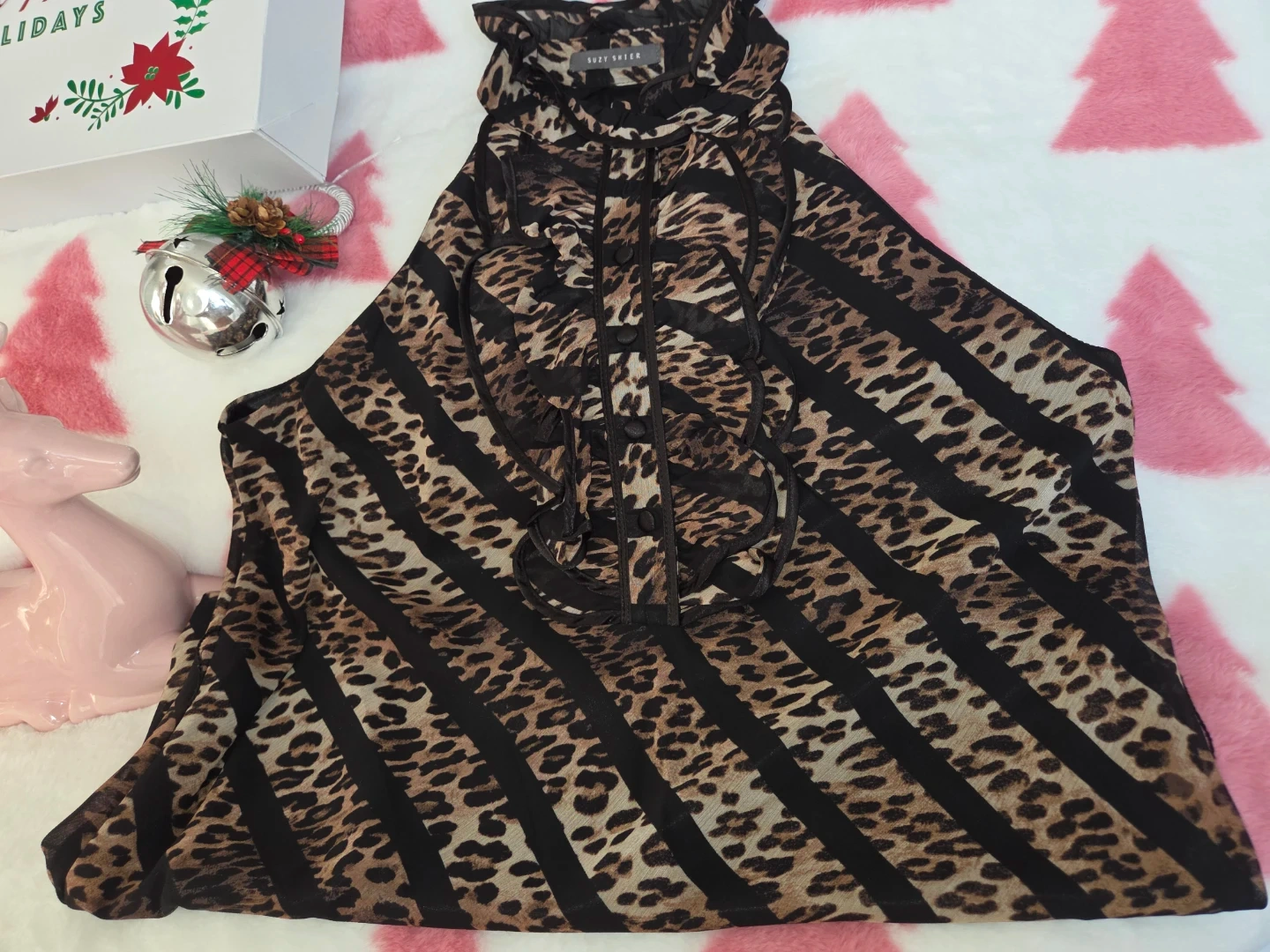Looking to sell this Suzy Shier halter top! It features a unique animal print with black stripes and a ruffled neckline. Great for adding a fun touch to your outfit!