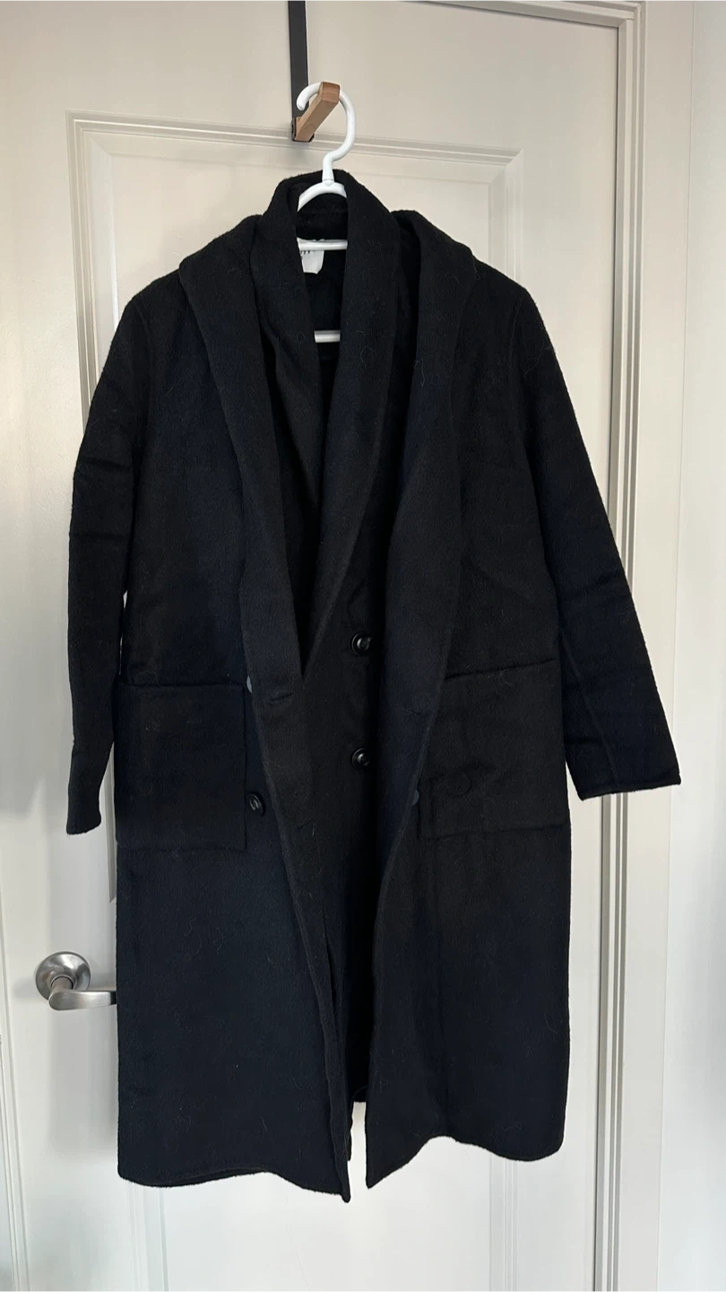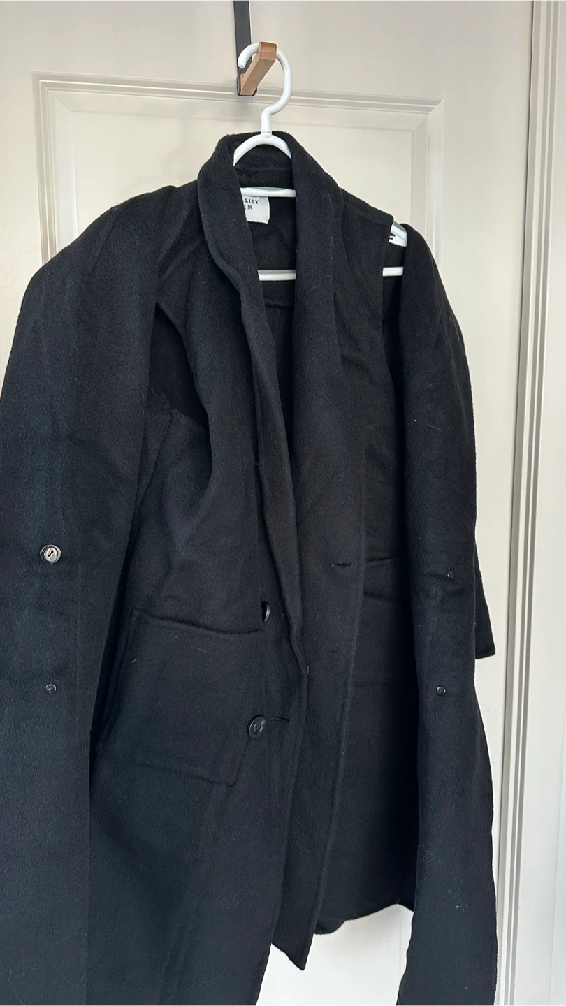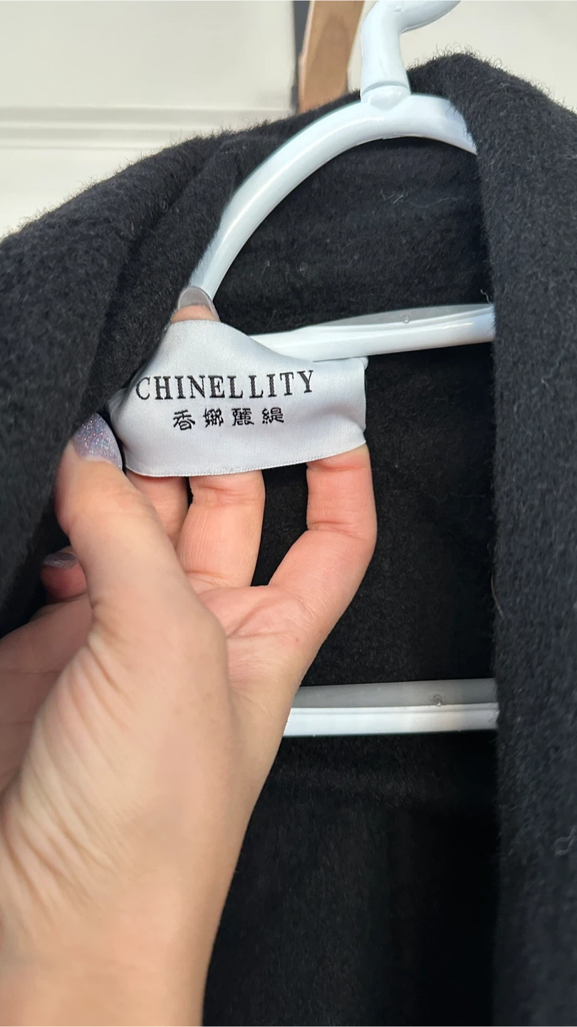 Selling a Chinellity coat in black. It's a wool blend and has a classic, stylish look. Perfect for the cooler weather!