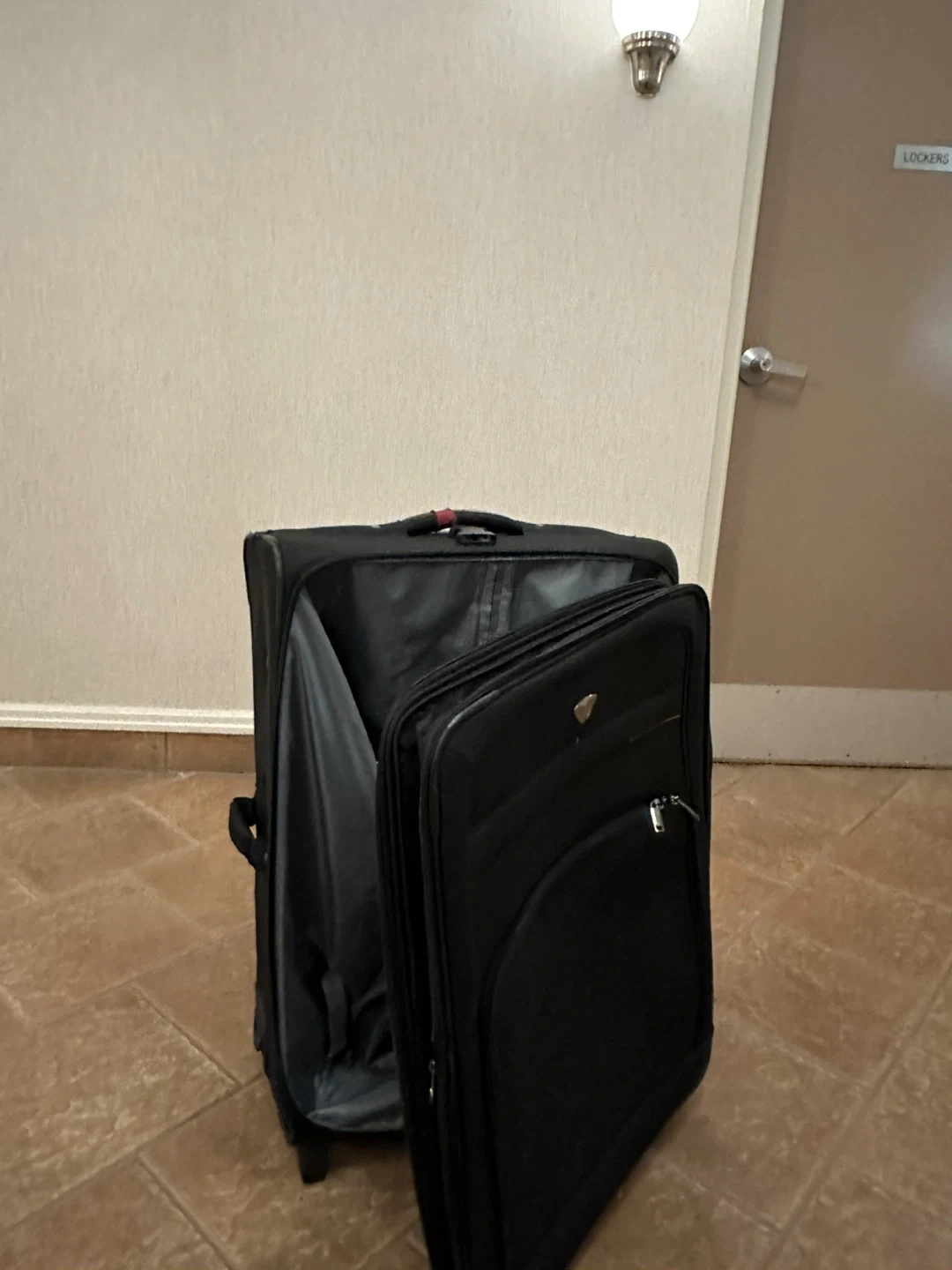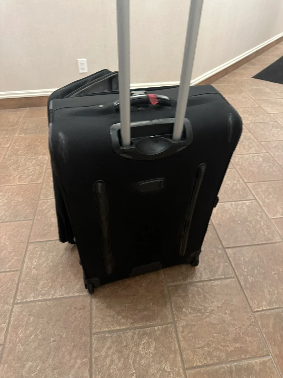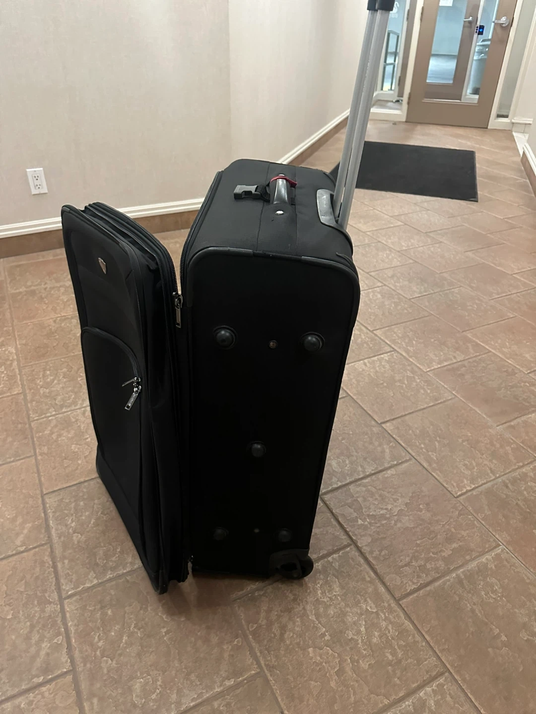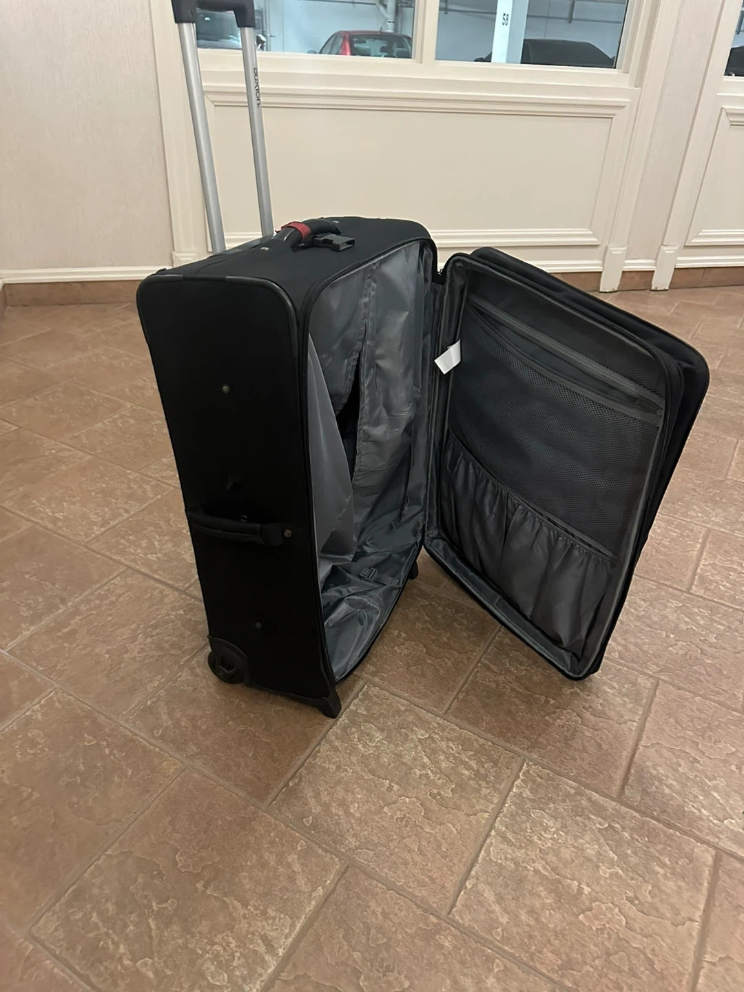 Selling a used Delsey luggage suitcase in black. It's in good condition and ready for your next trip! The suitcase has a retractable handle and wheels for easy transport