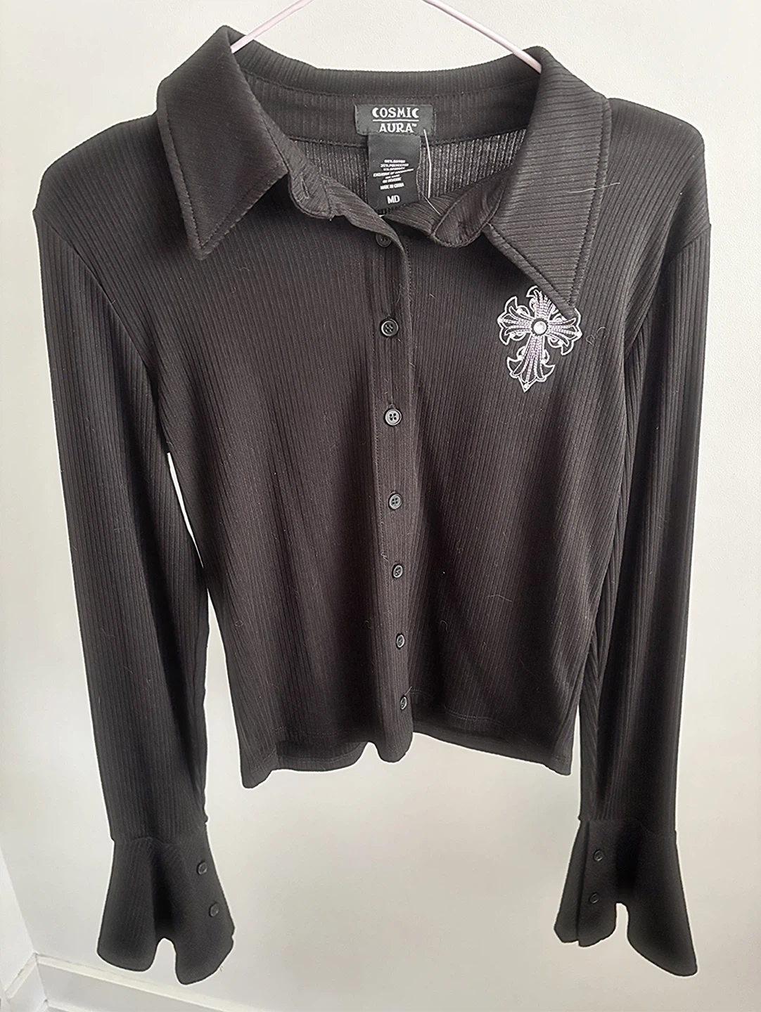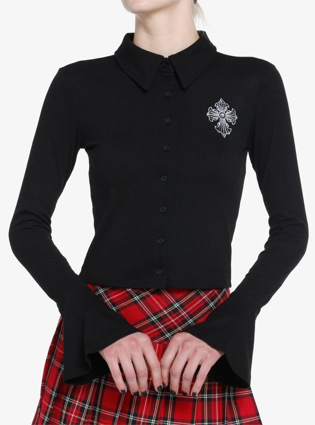 Get in with the goth academia vibe with this ribbed button-up top featuring bell sleeves and an embroidered and embellished gothic cross on the chest.