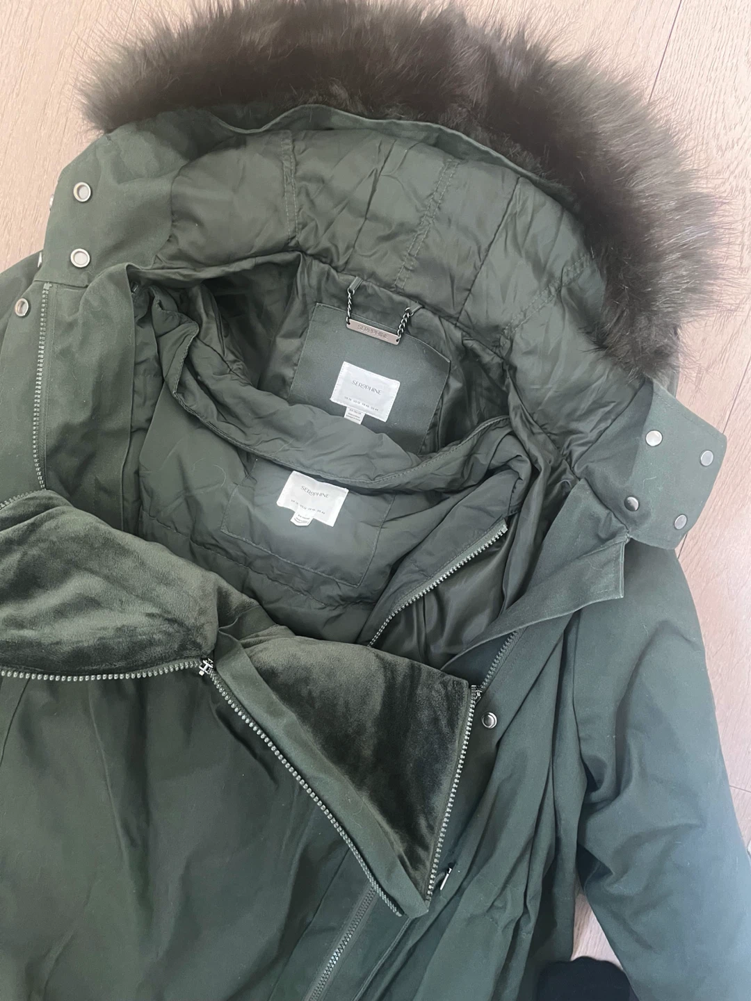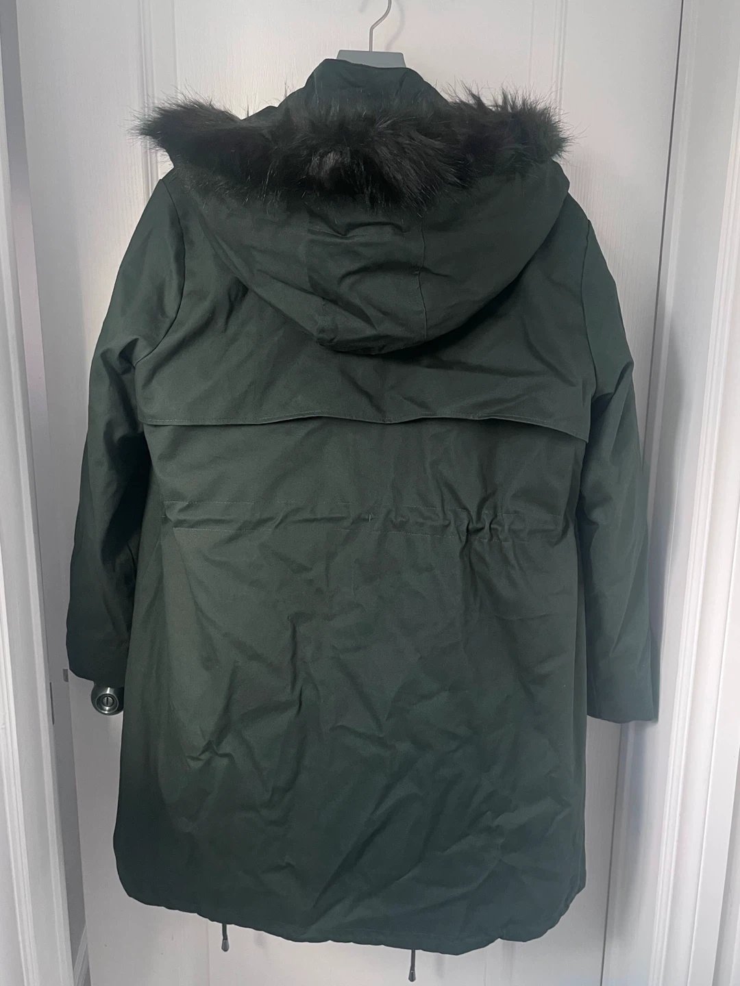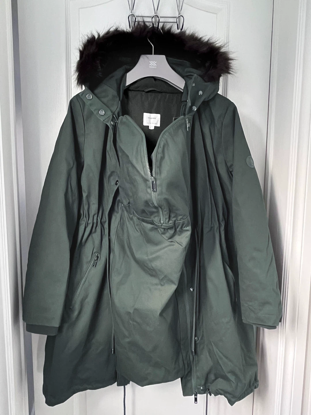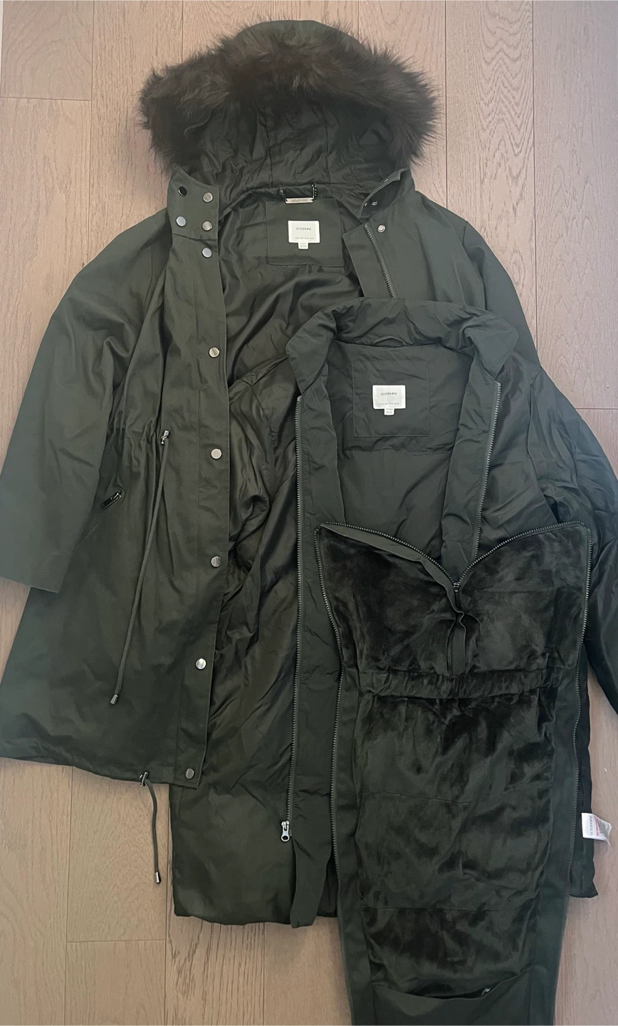 Like new! Mid-length maternity & baby wearing jacket with removable down-filled liner, removable faux fur trim, and removable kangaroo panel (can be worn as a regular coat when not baby wearing!) Drawstring ties at the empire waist adjust the fit to grow with you.