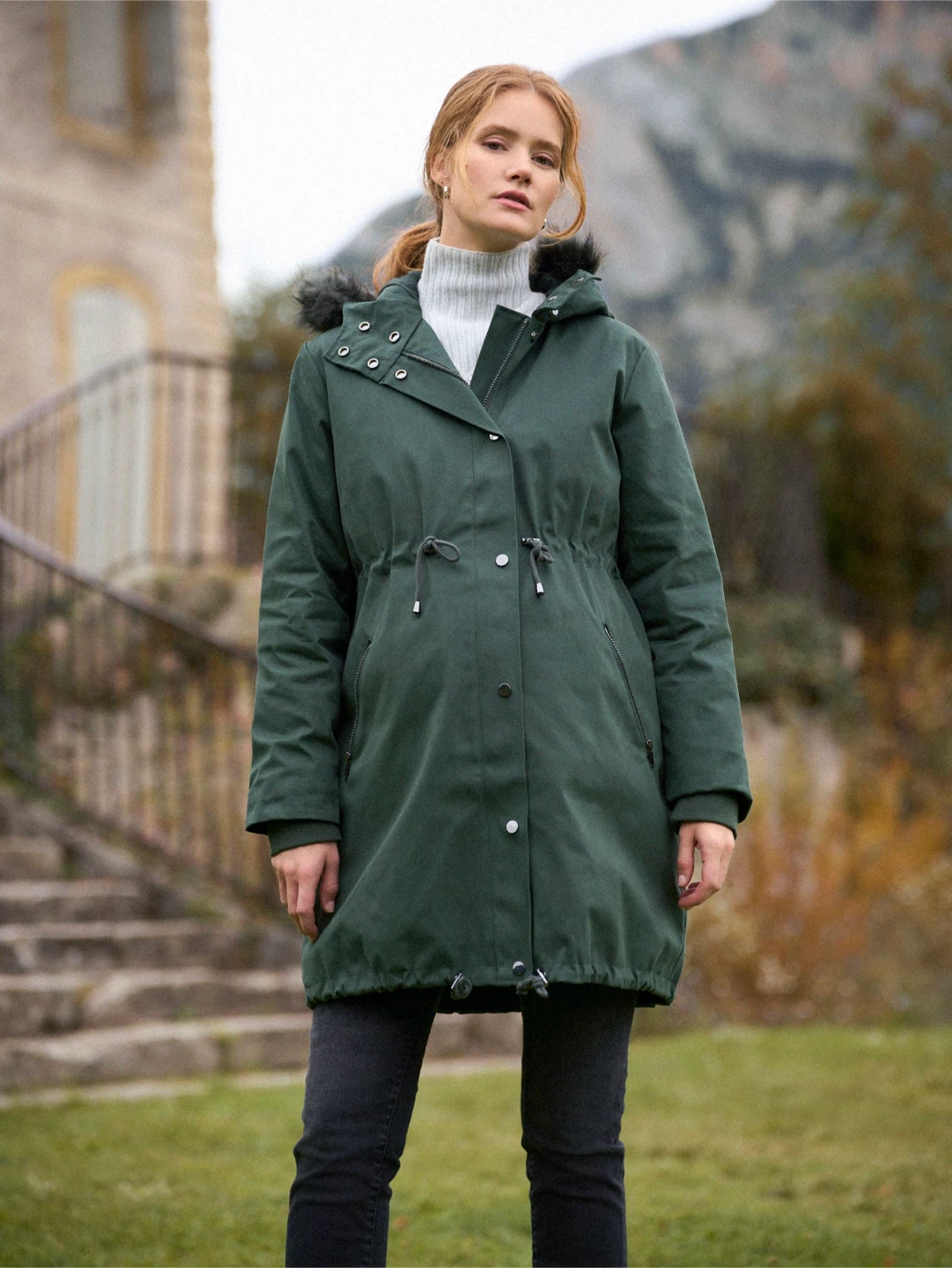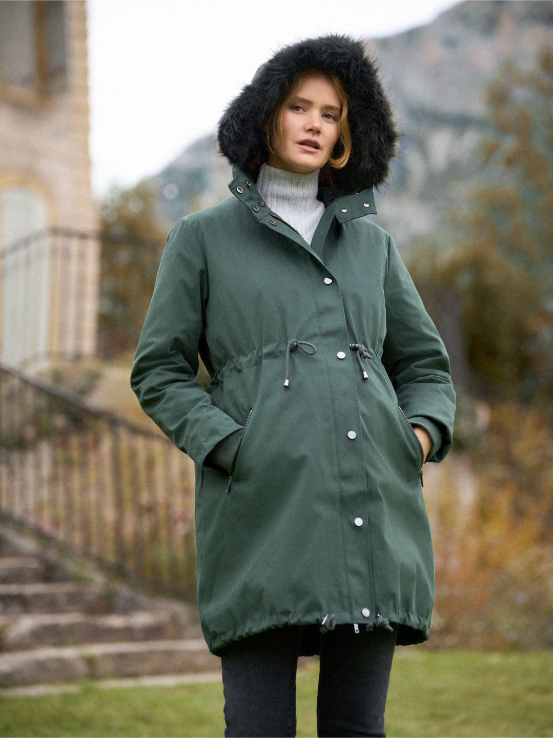Hood with faux-fur trim.