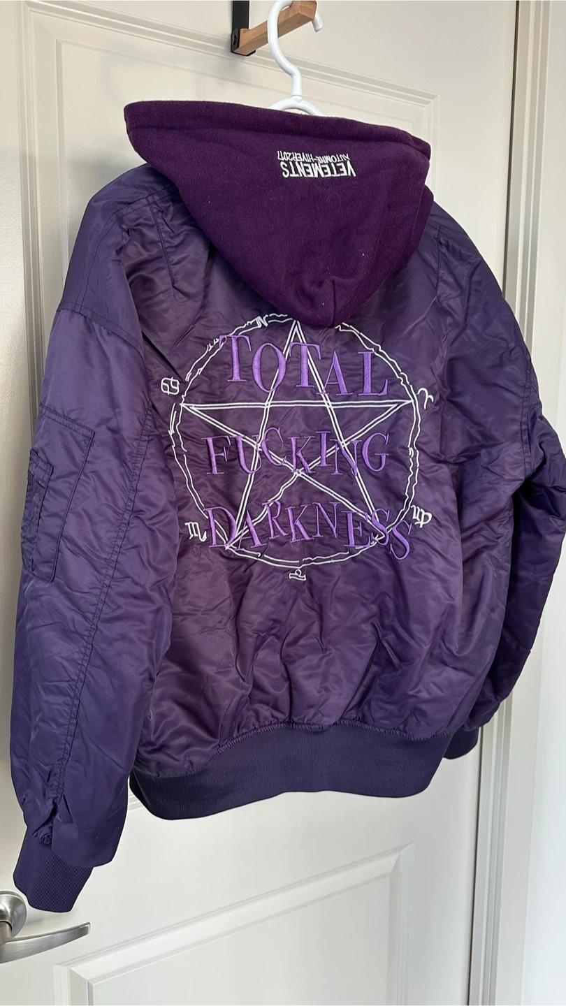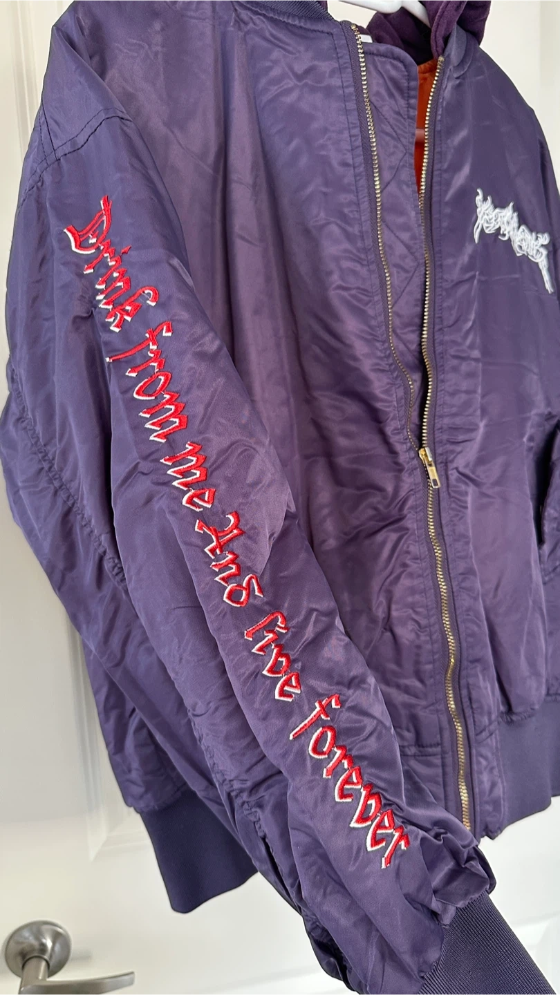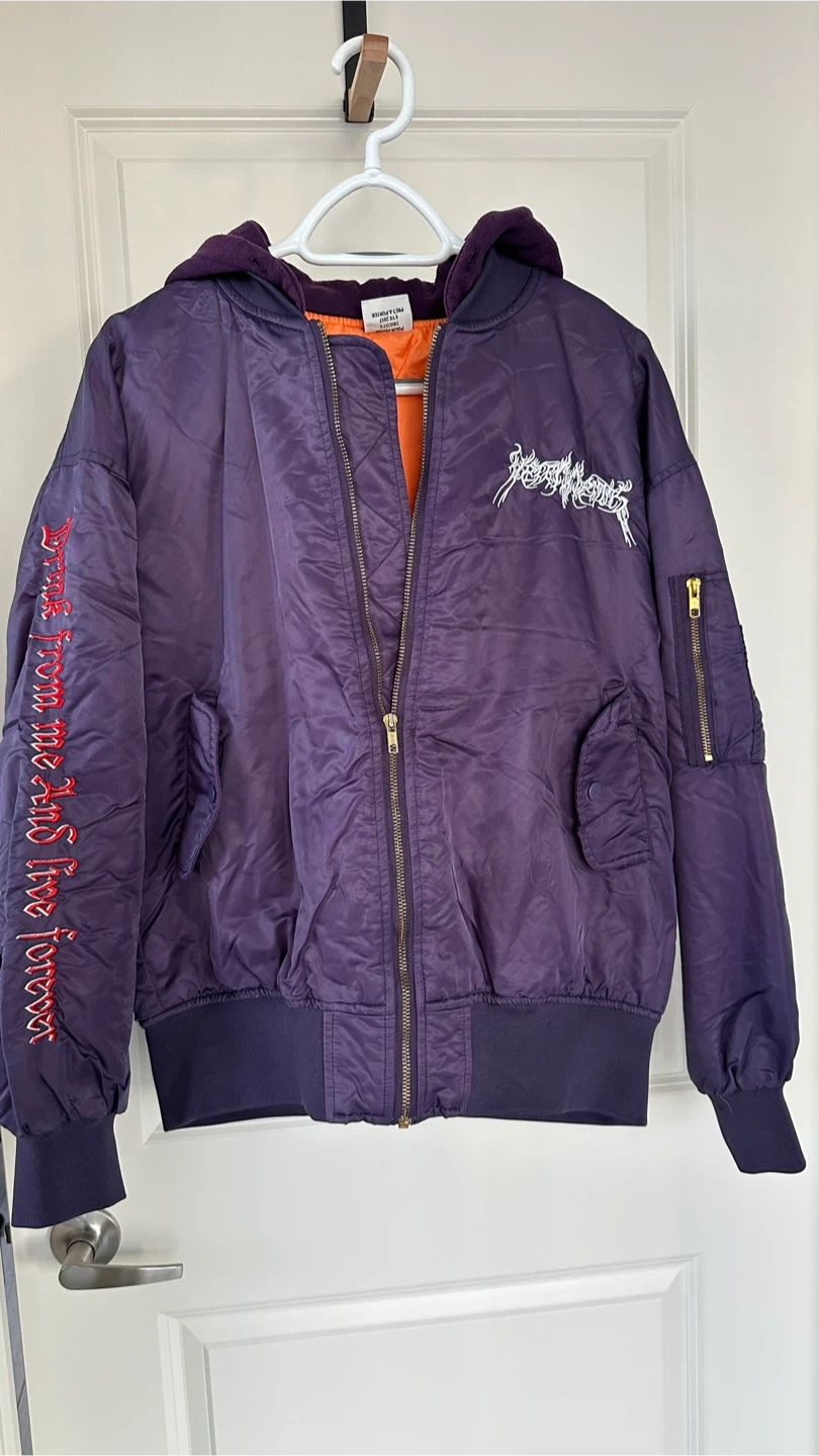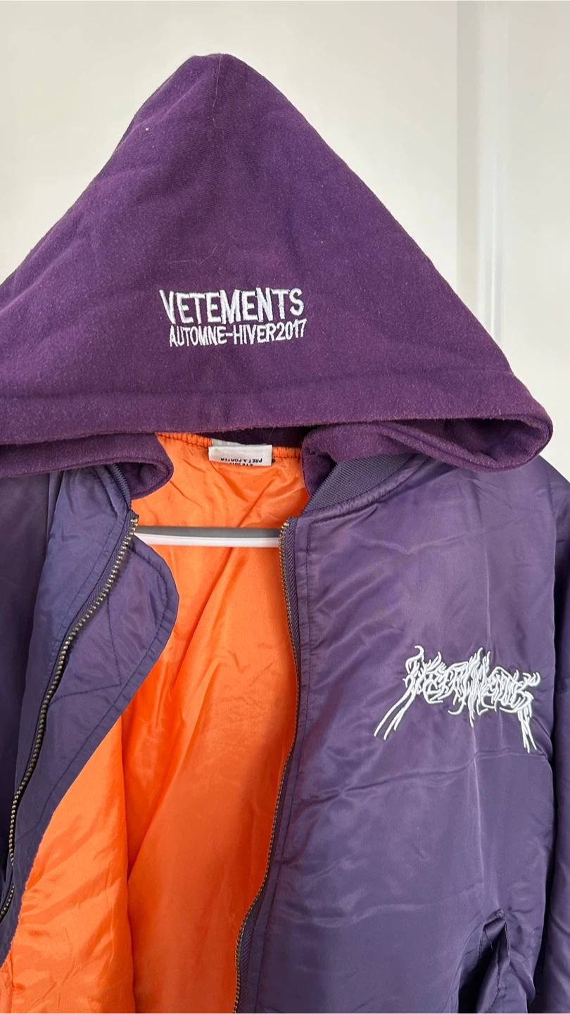 Selling a Vetements Autumn-Winter 2017 bomber jacket in size Small/Medium. It's a unique piece with a purple exterior and orange lining. The jacket features distinctive graphics and text details. The material is 80% cotton and 20% polyester.