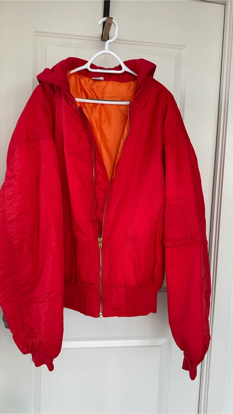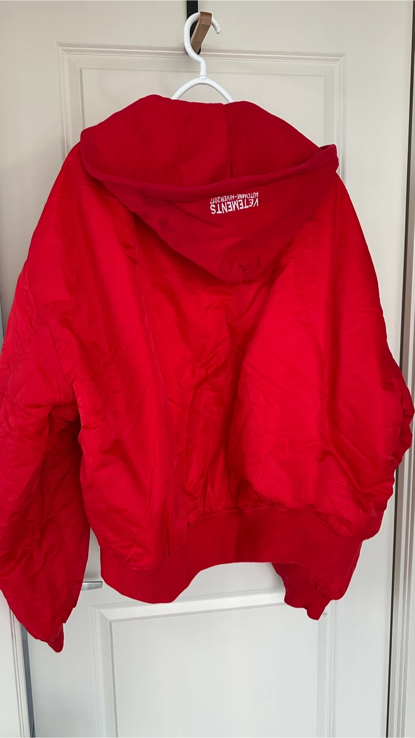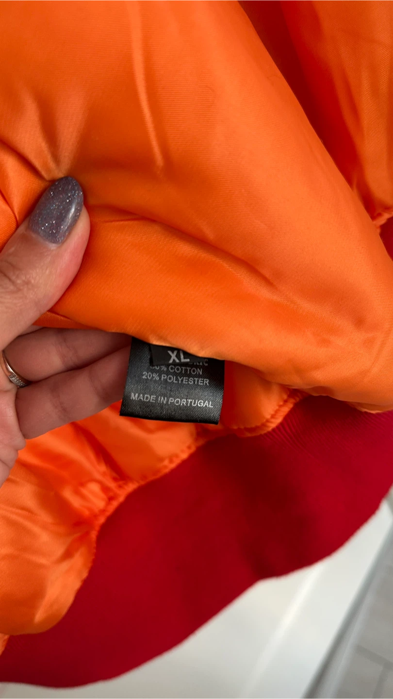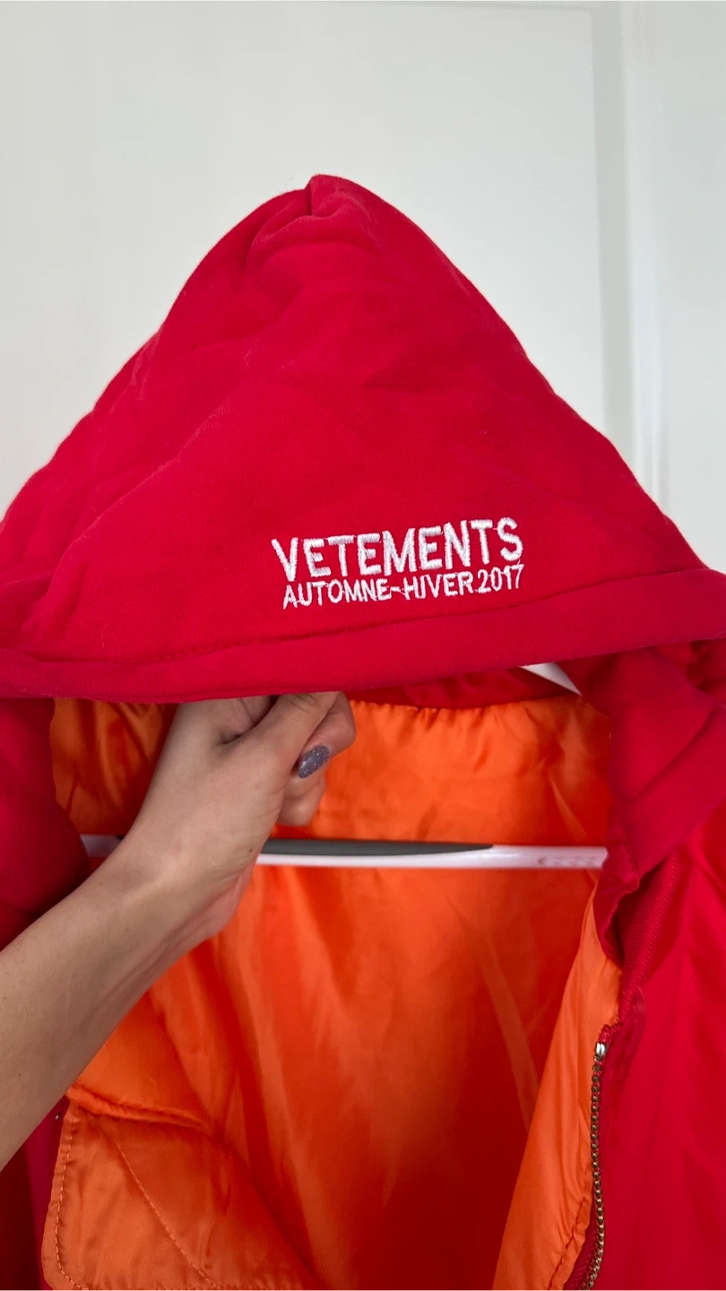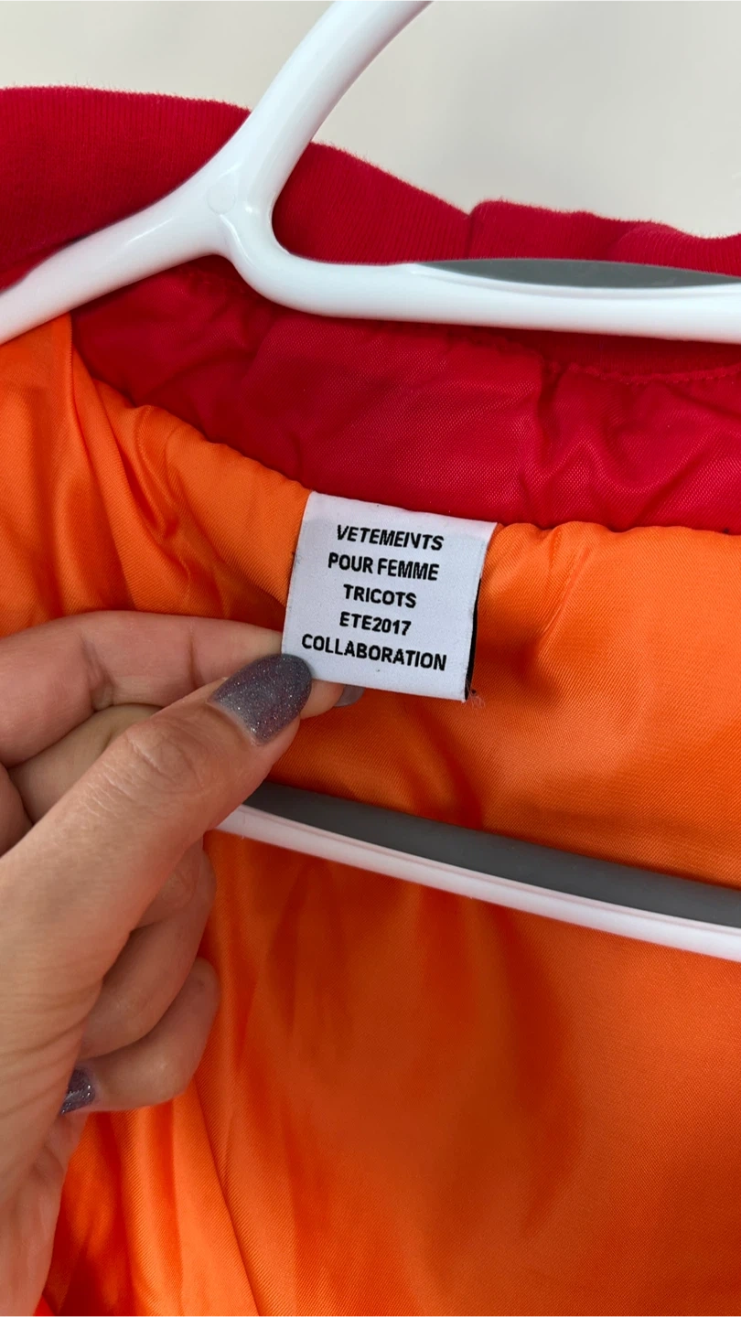 I'm selling a Vetements jacket in size XL. This is a collaboration from the Tricots ETE2017 collection. The jacket is red with an orange lining and is made in Portugal. It's composed of 80% cotton and 20% polyester