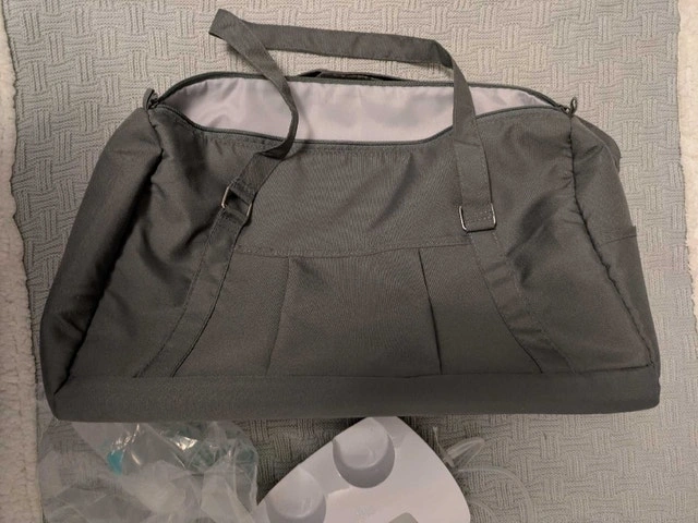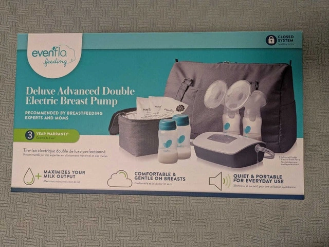I am selling a deluxe Evenflo double electric breast pump, nearly new, as you can see in the pictures. It's a closed system pump. Features: * Adjustable suction levels * Multiple flange sizes for comfort * Includes a convenient tote bag and cooler * Hygienic closed system Asking $120 OBO