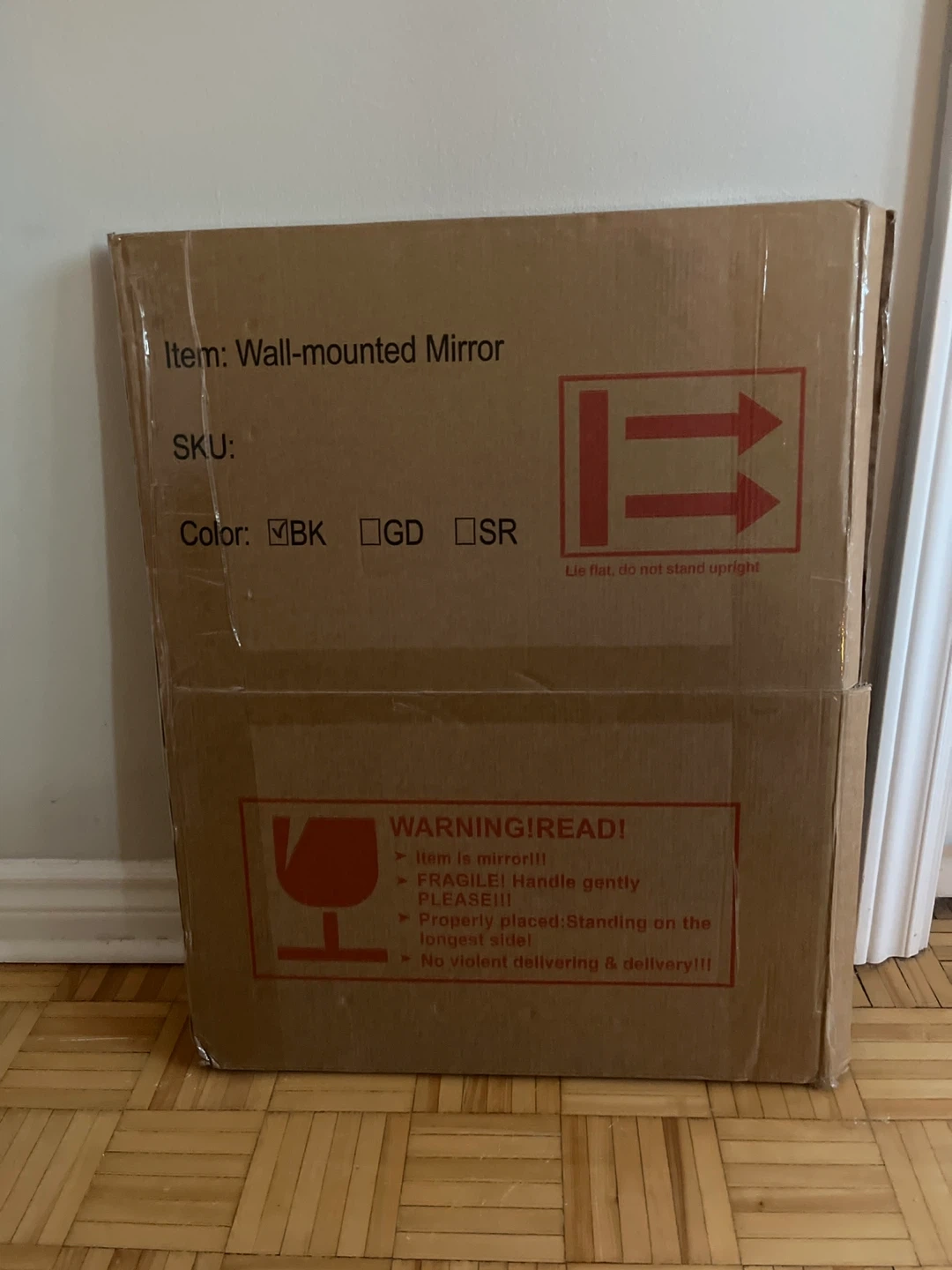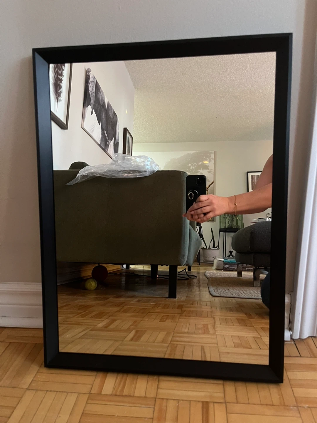 Selling a wall-mounted 18x24 mirror with a sleek beveled black metal frame. It's in new condition and comes in its original box. Never been used, wasn’t the size I needed. Perfect for adding a touch of elegance to any room!