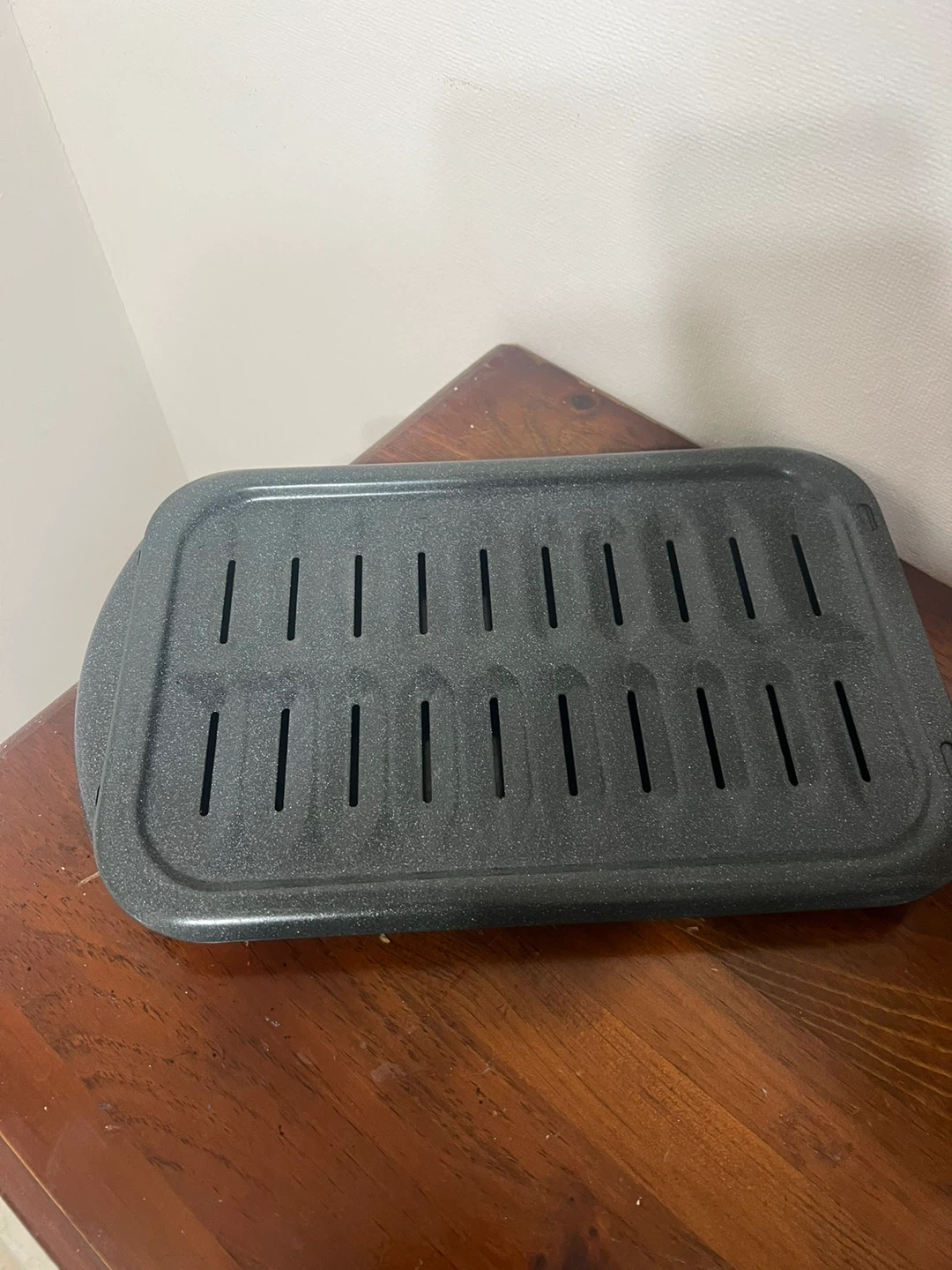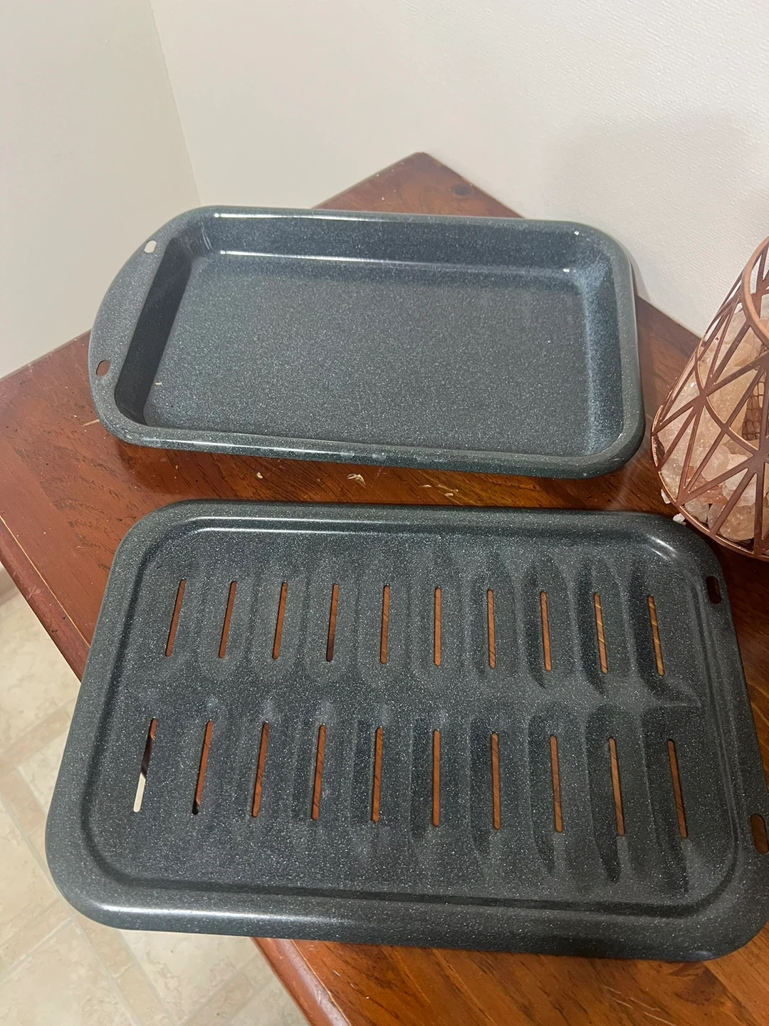 I have a set of two grey baking pans for sale! They're in great shape and ready for your next baking project. One is a standard baking pan, and the other has a rack insert. Perfect for roasting or baking!