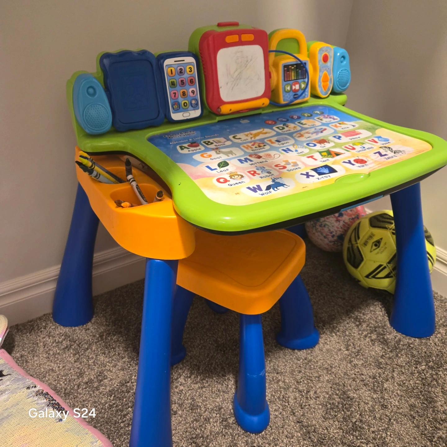 Selling a VTech Alphabet Activity Desk in good used condition! It's a fun and interactive way for kids to learn their ABCs and more. The desk features an alphabet keyboard and interactive games to help children develop language and early learning skills. It's perfect for toddlers and preschoolers! Study table with stool