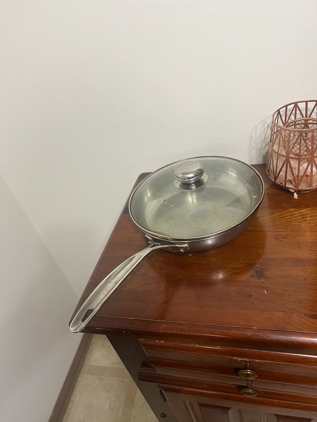 Selling a stainless steel frying pan, perfect for cooking up your favourite dishes! It comes with a lid to help trap heat and moisture. It's in good condition and ready for a new kitchen
