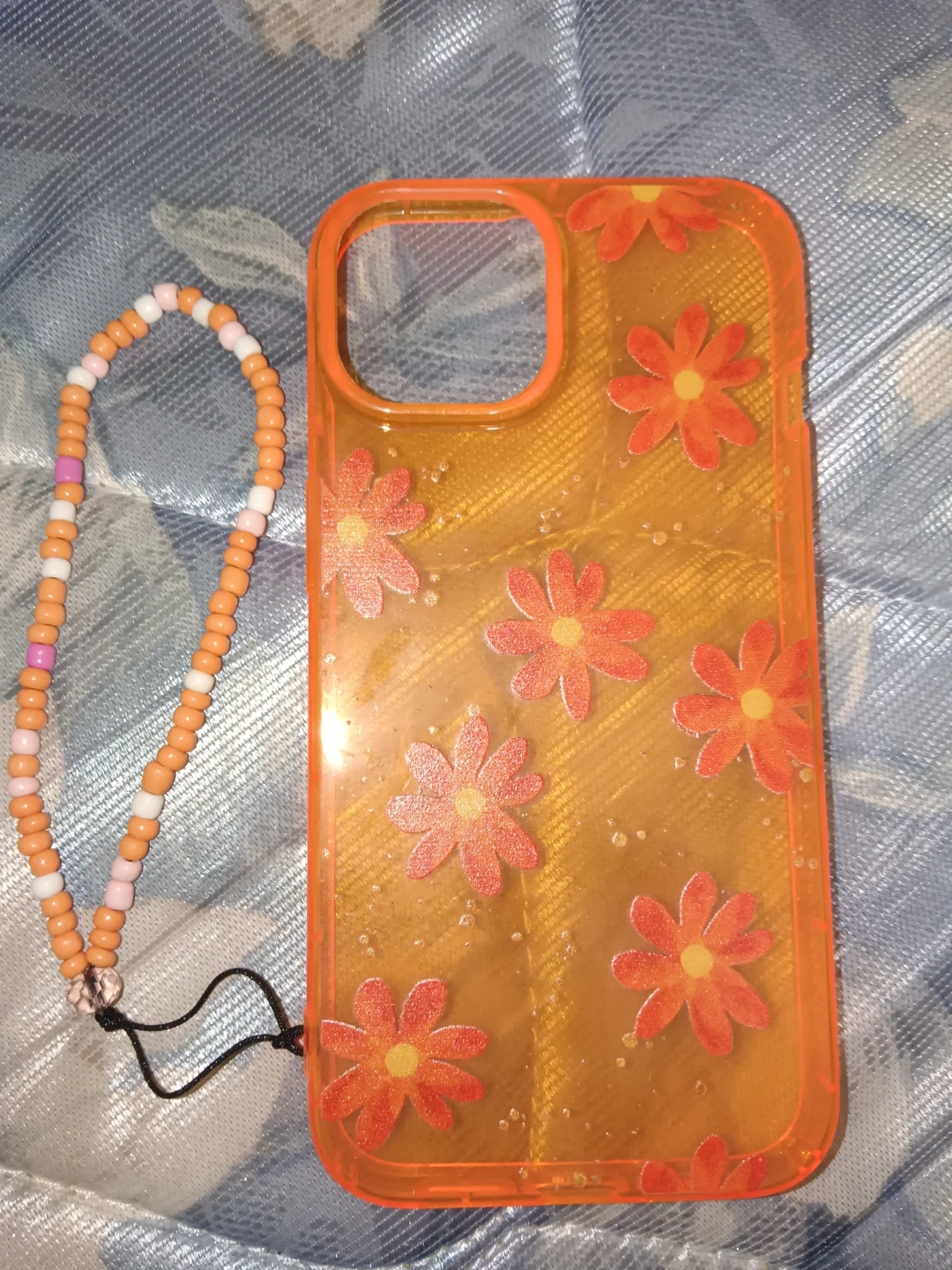 Cute orange phone case with a floral design! It also comes with a beaded strap in matching colours. Perfect for adding a bit of fun to your phone! It's for iPhone 13.