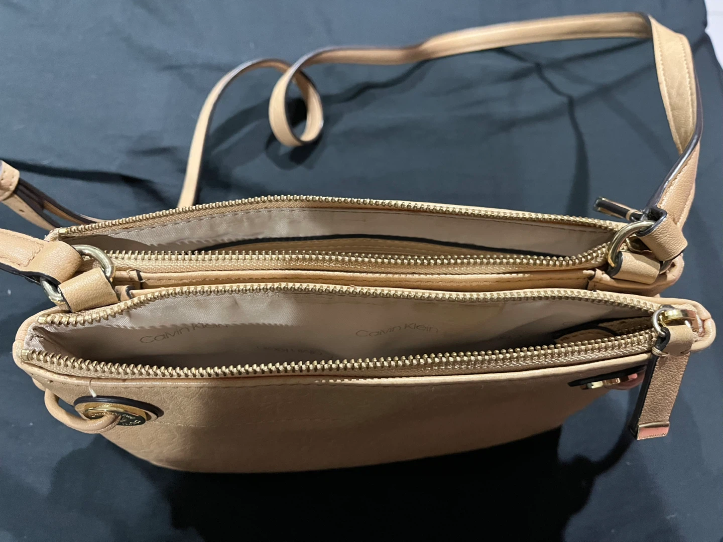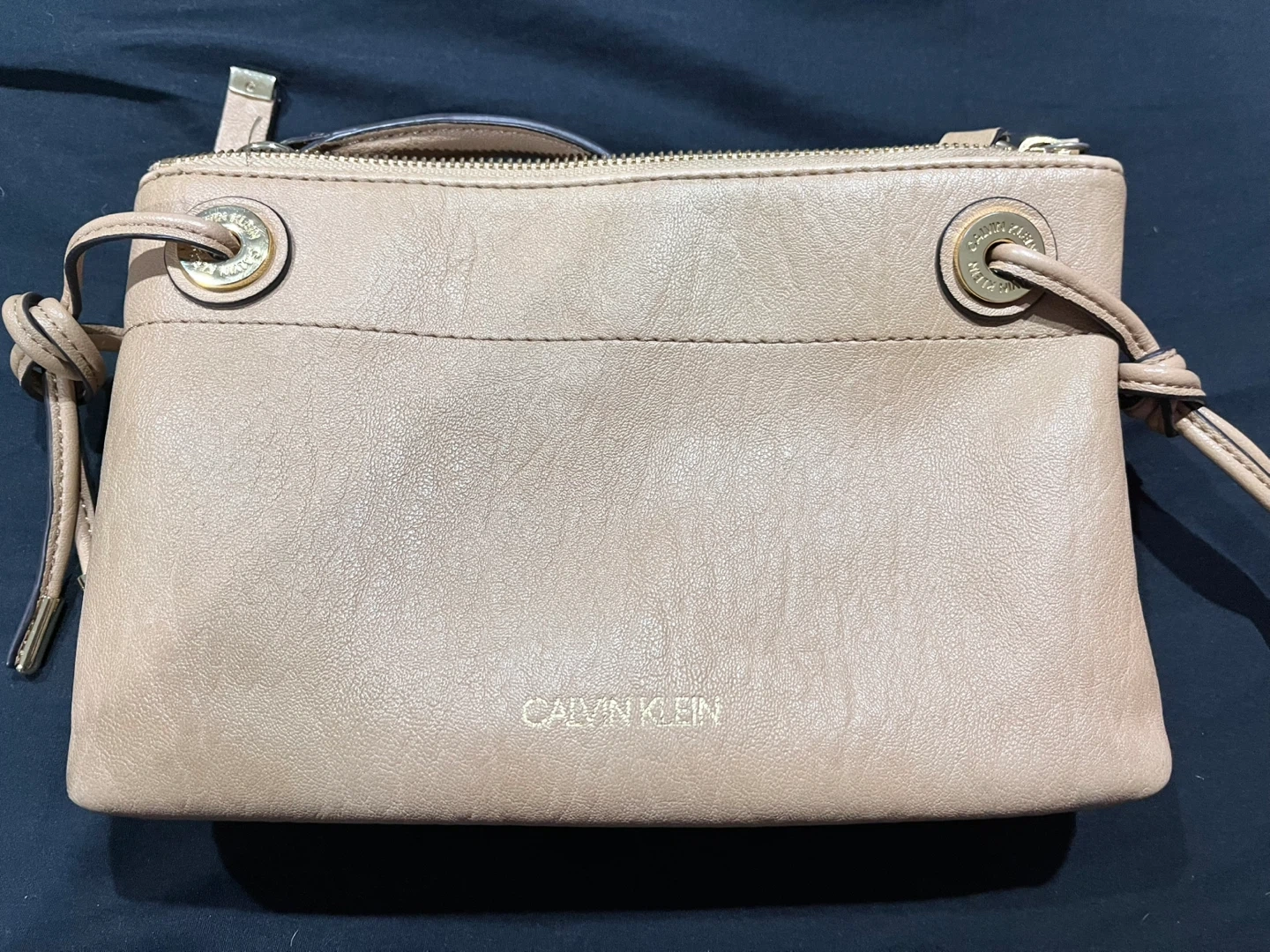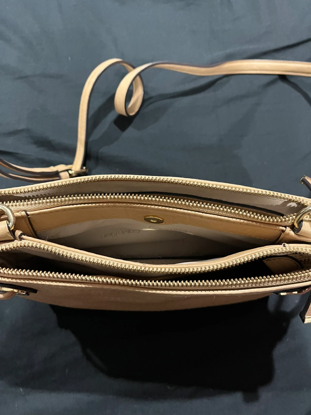 A cute Calvin Klein crossbody bag in a neutral beige colour. It's in good condition and has a few compartments to keep your belongings organized.