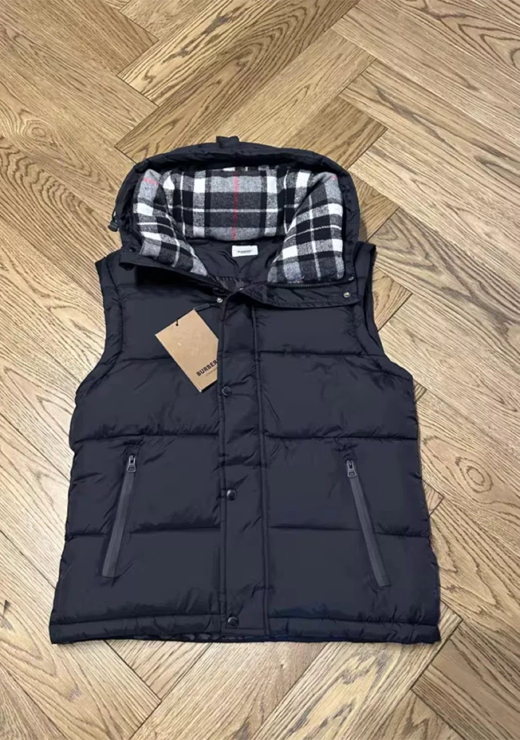 Here's a stylish Burberry puffer vest in black! It features a hood with a cool plaid pattern on the inside. Perfect for layering during those chilly days!