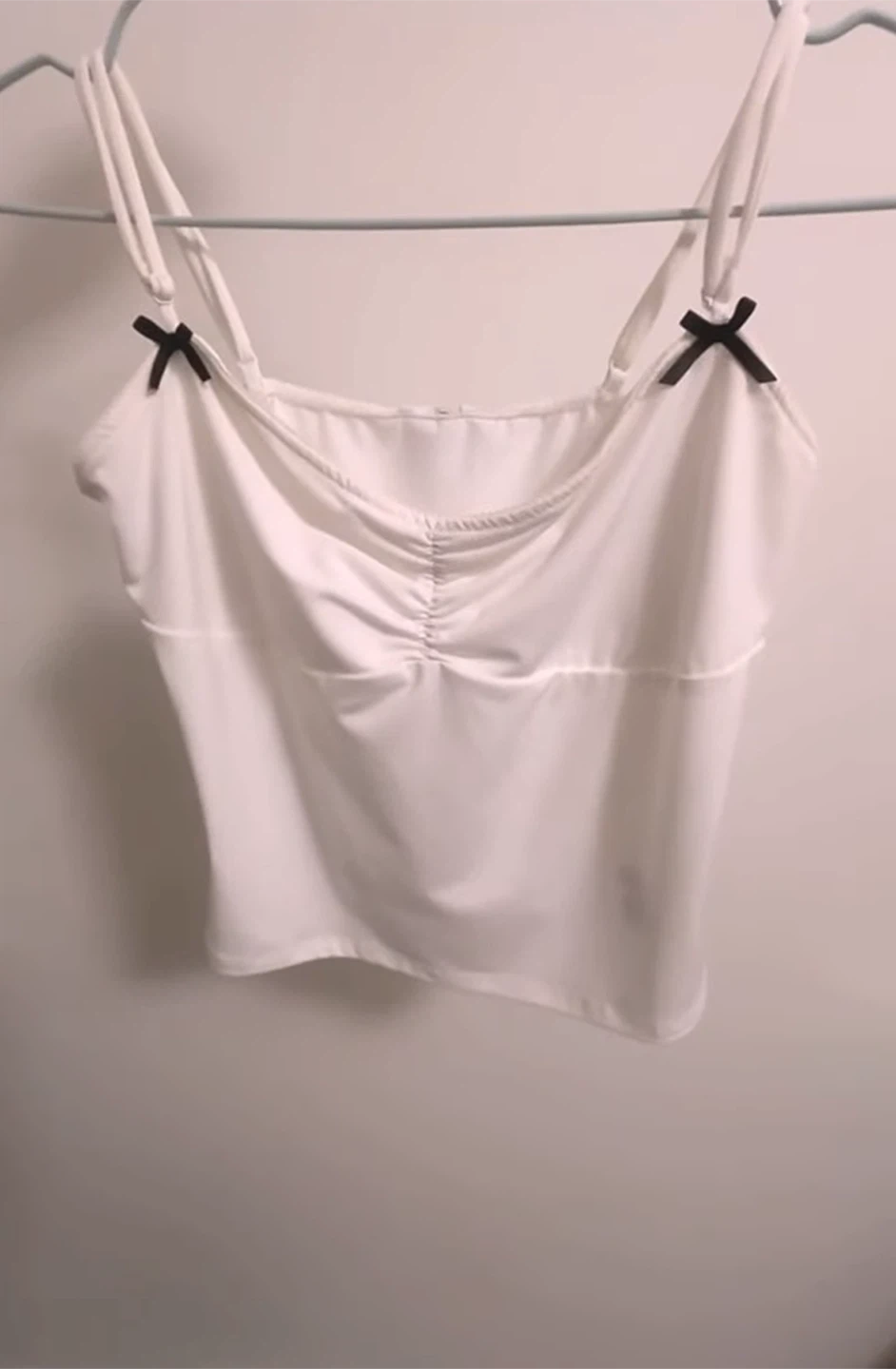 Design: The top features adjustable spaghetti straps with black bow details, a ruched front with seams, and is typically a cropped length.