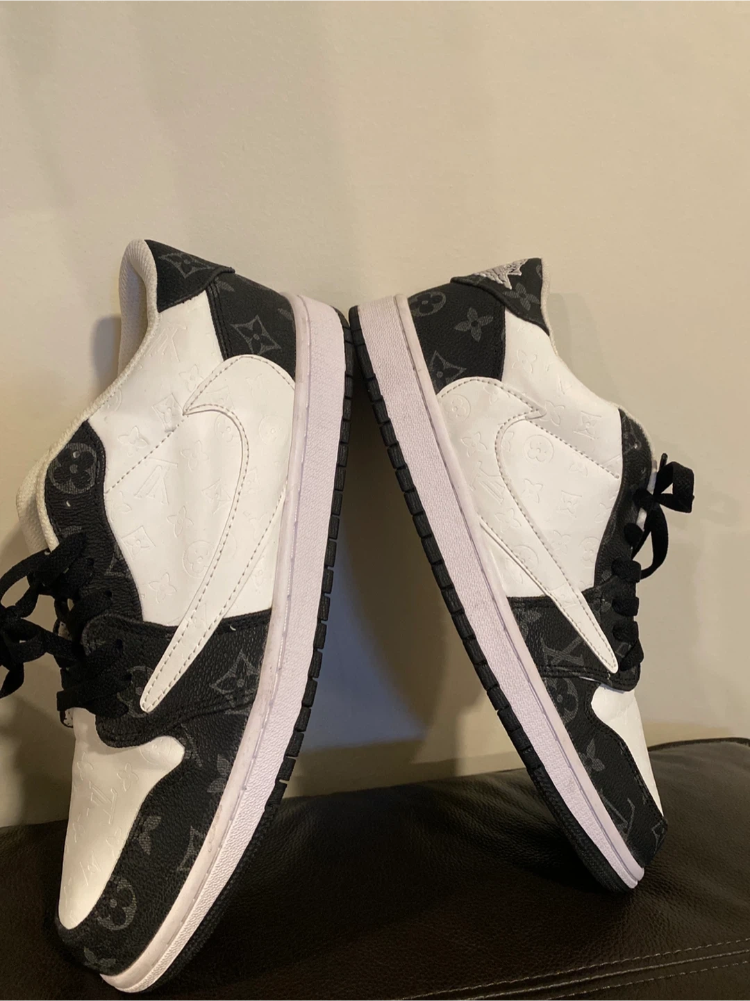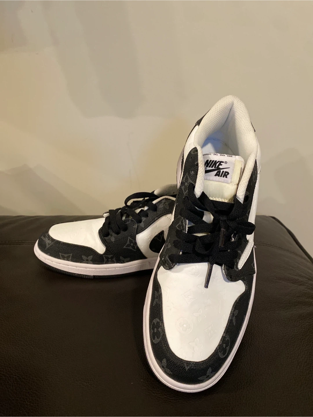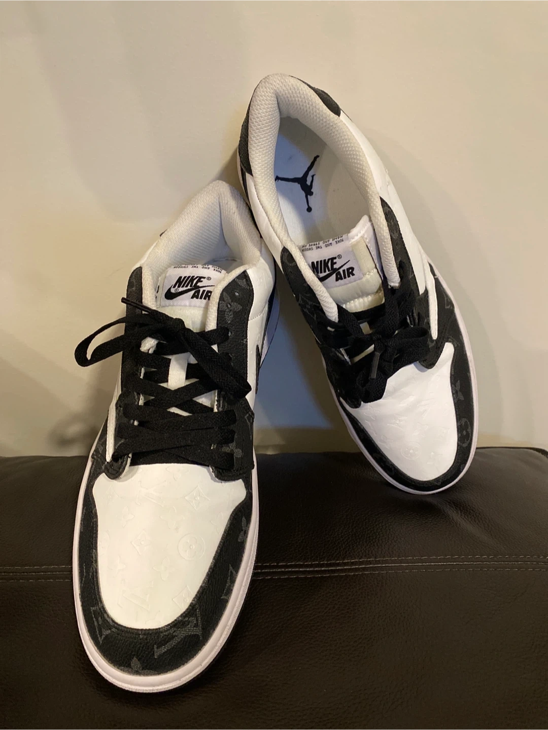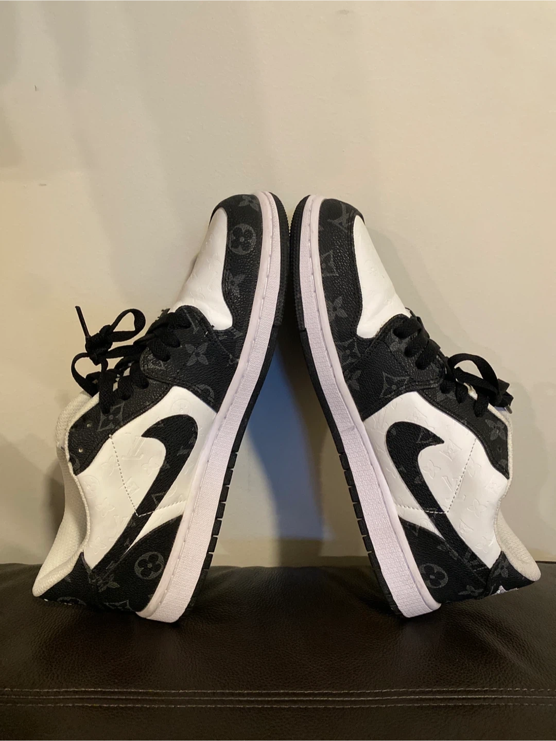 Here are a pair of Nike Air Jordan 1 Low sneakers with a custom Louis Vuitton design. They feature a black and white colour scheme. Great for adding a unique touch to your style!