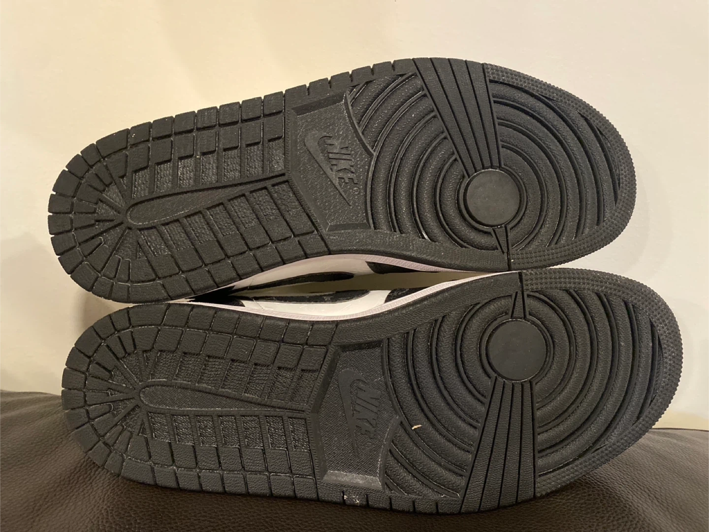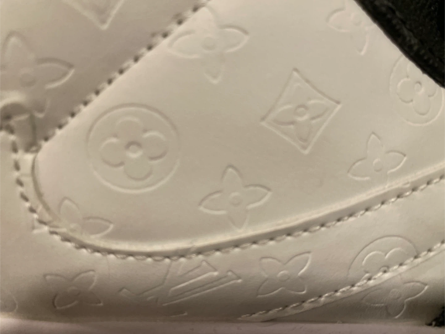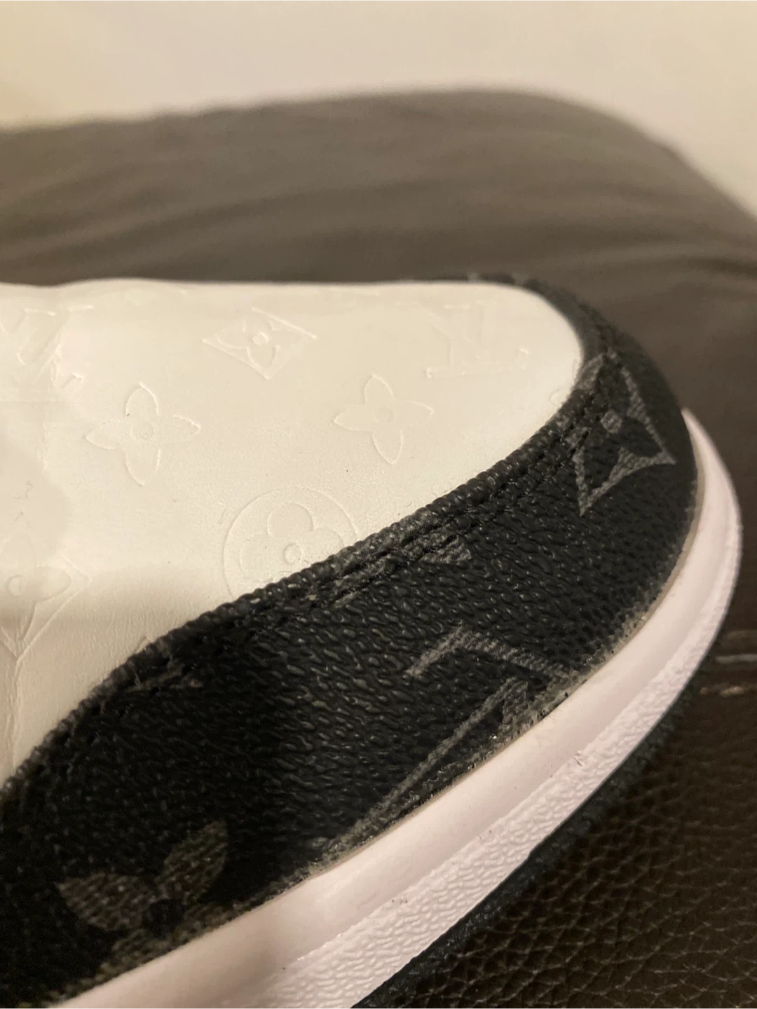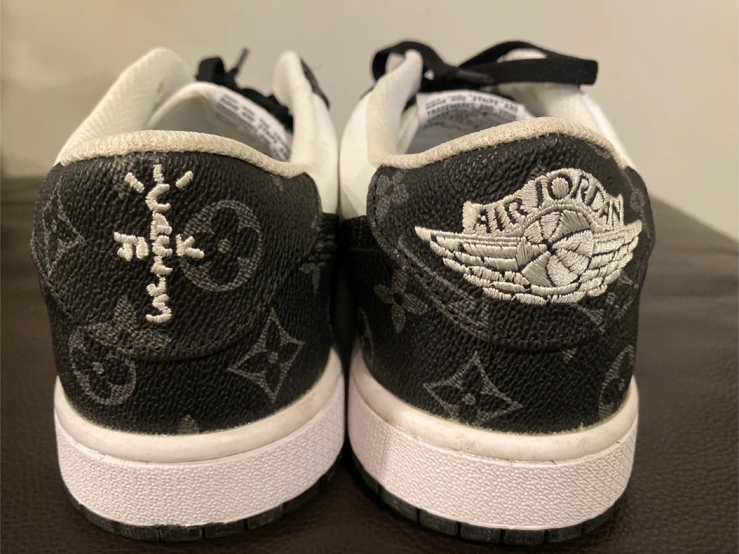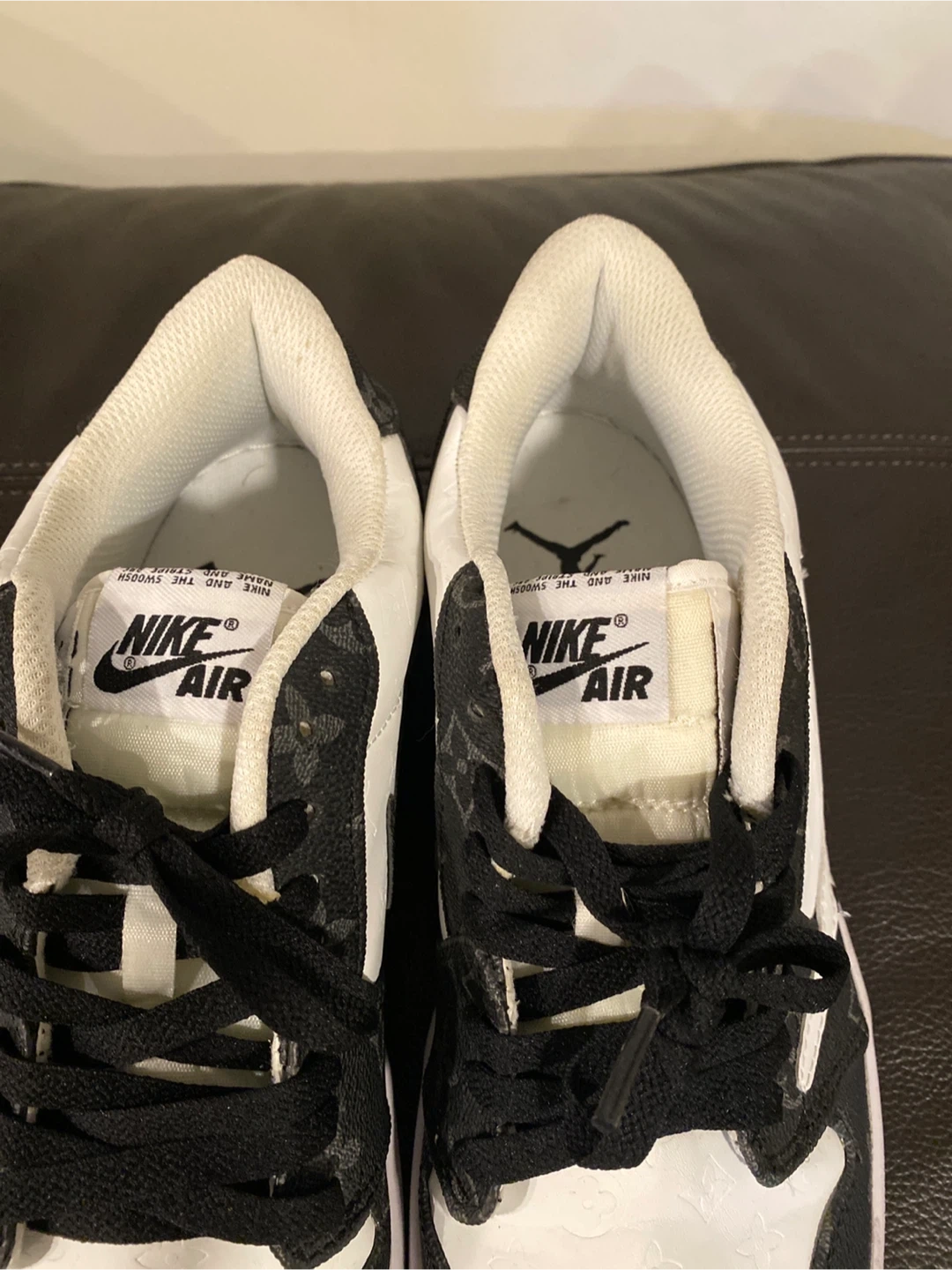 Here are a pair of Nike Air Jordan 1 Low sneakers with a custom Louis Vuitton design. They feature a black and white colour scheme. Great for adding a unique touch to your style!