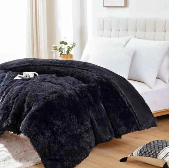 Luxurious Faux Fur & Velvet Design – Crafted with ultra-soft black faux fur on the front and smooth velvet on the reverse. Includes 1 queen-size light-down comforter (90" x 90") zipped into the exterior black faux fur.