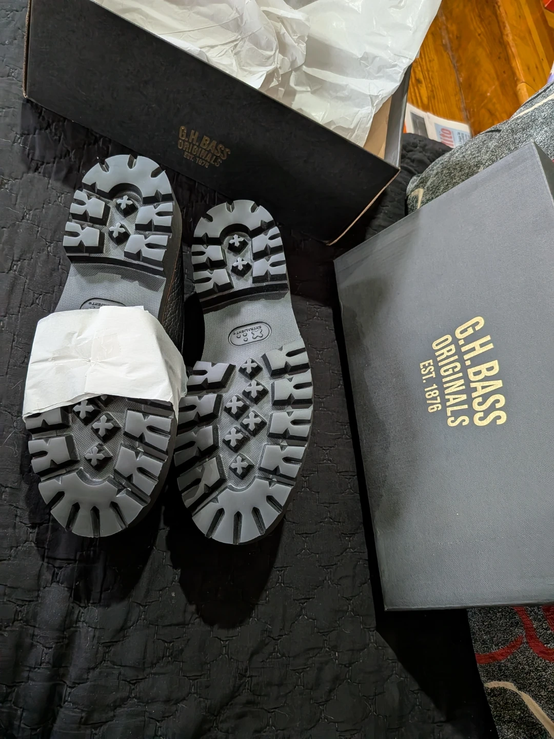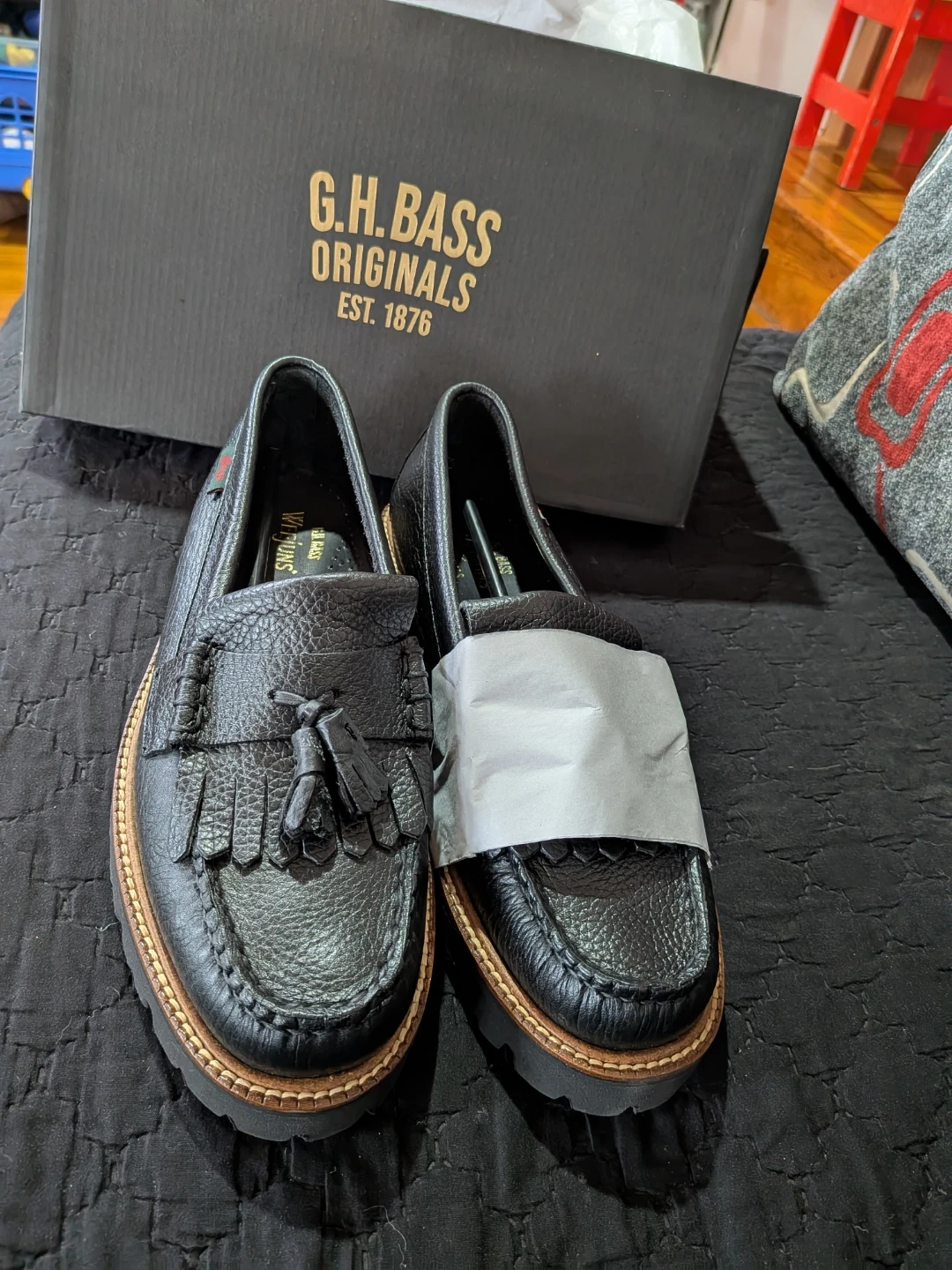 Selling a pair of G.H. Bass Layton Soft Super Lug loafers in US size 7. These stylish black loafers come with their original box. They're in great condition and ready for a new owner!