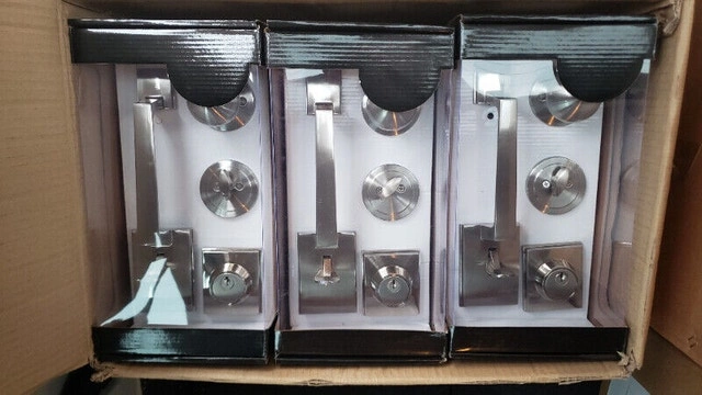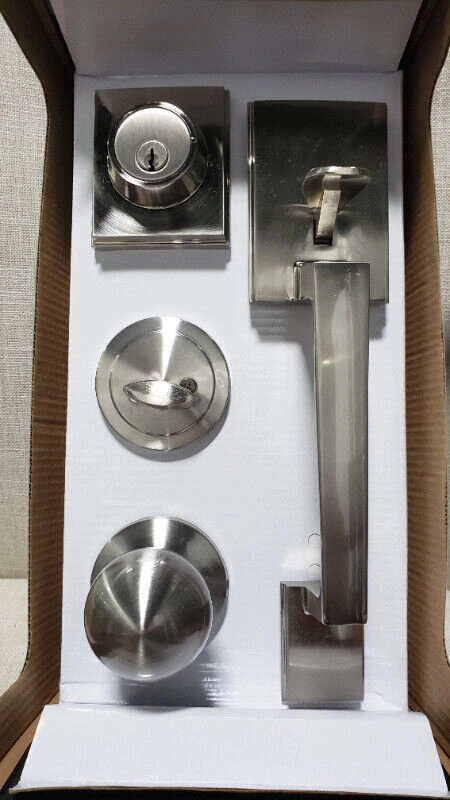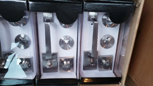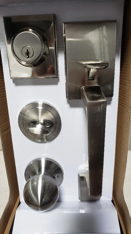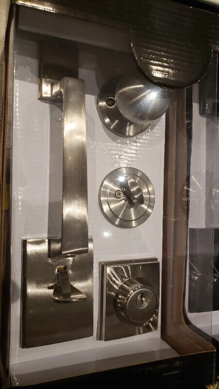 BRAND NEW IN BOX!!! Never used Lockset and handle for exterior doors. Comes in 2 colors: Brush Nickle color ($59) and Satin Nickle (silver) ($60). Price is Firm.