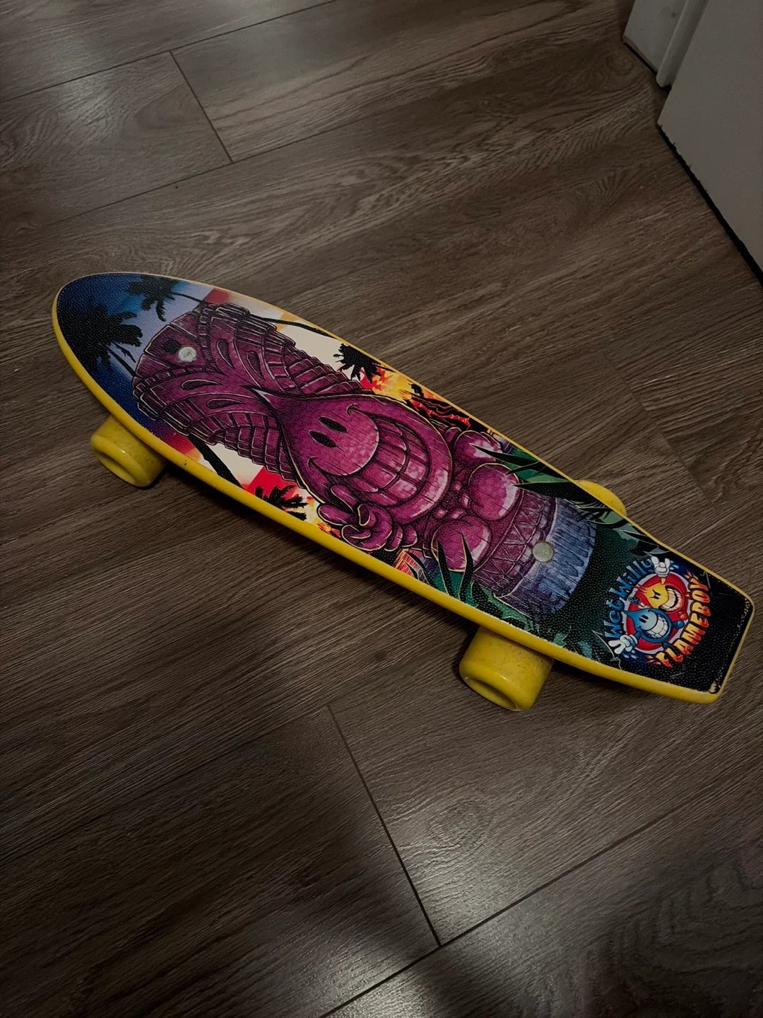 Selling a Hot Wheels Flameboy skateboard! It's in really good condition, barely used. The deck features a cool tiki design with palm trees. The wheels are yellow. Perfect for beginners or experienced skaters looking for a compact board