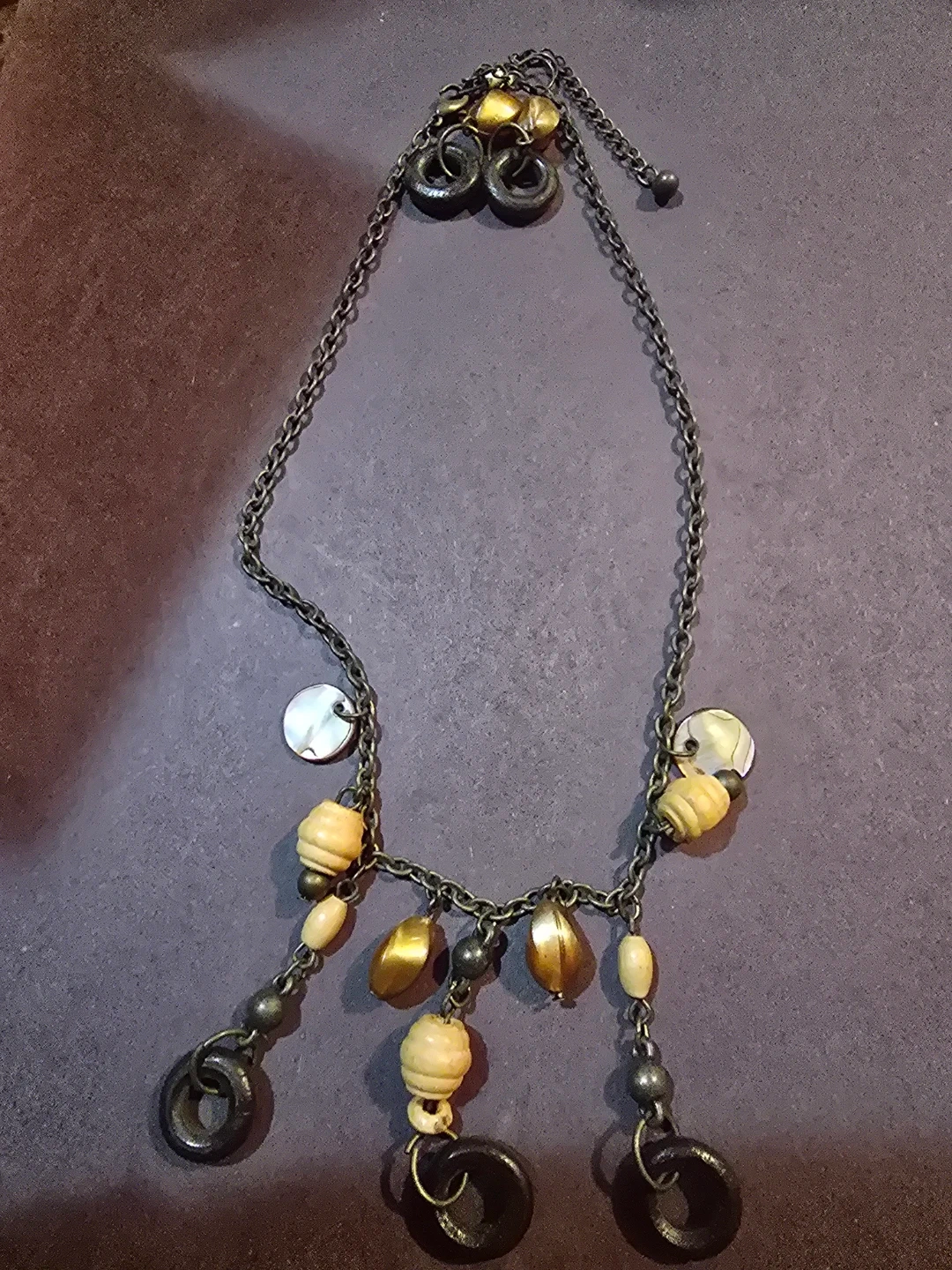 Unique necklace featuring a mix of wooden and metal elements! It has a chain with various charms and beads. The necklace is in good condition and ready to accessorize your outfits