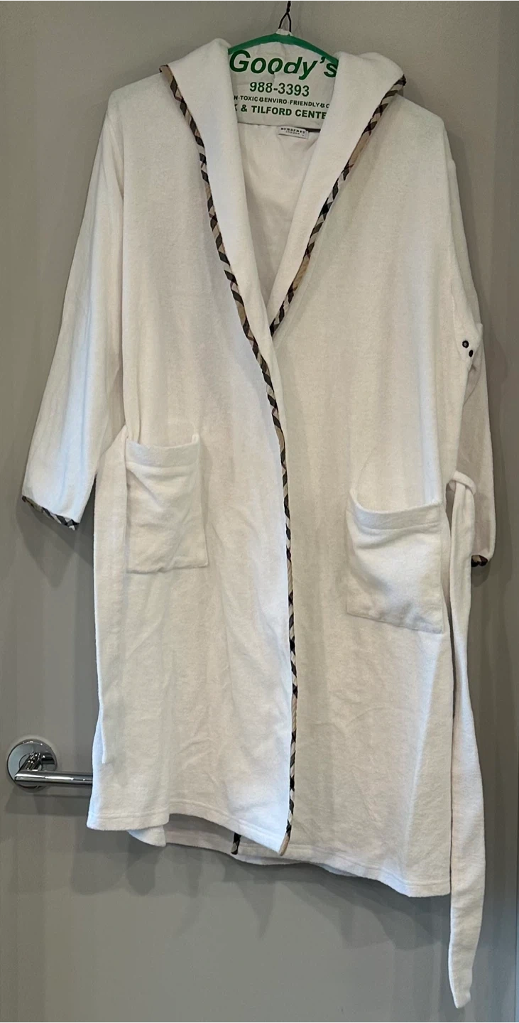 Authentic ❗️New unused Burberry London Terry cloth bath robe in white with hood and two pockets. It's a size medium and features the classic Burberry check pattern on the trim.