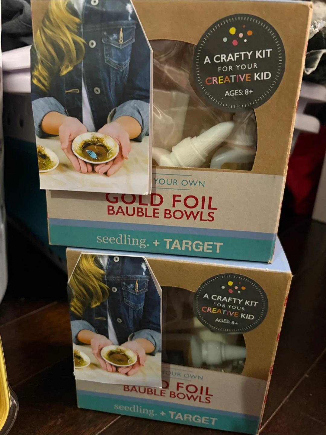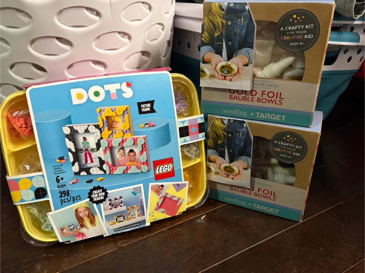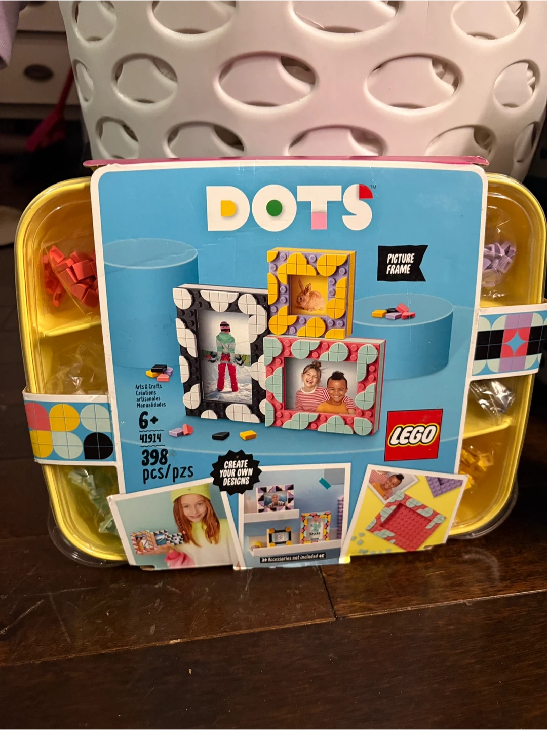 I'm selling a LEGO DOTS Picture Frames set (41914) with 398 pieces, perfect for ages 6+. Also included are two Seedling 'Design Your Own Gold Foil Bauble Bowls' craft kits, recommended for ages 8+! Great for creative kids