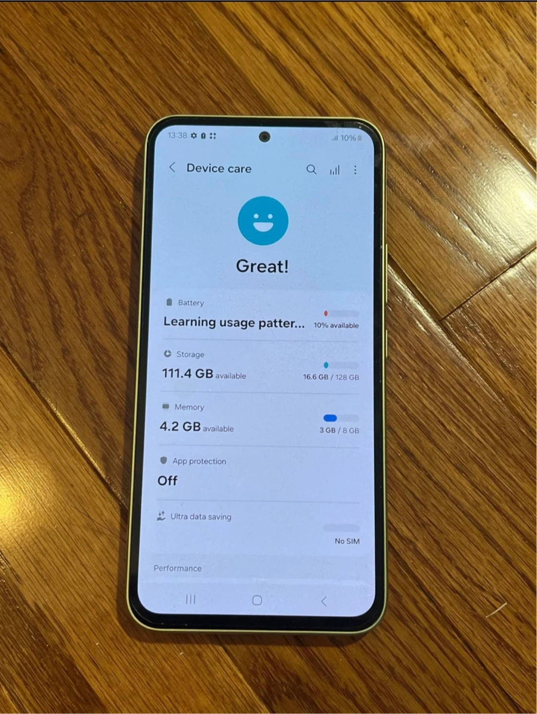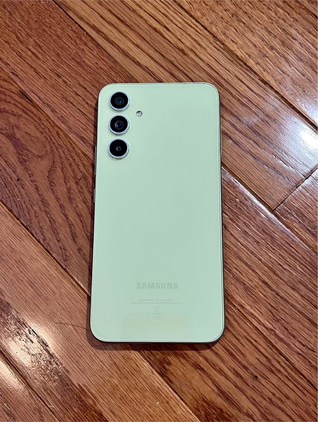 Selling a Samsung Galaxy A54 5G in light green. It has 128 GB of storage and 8 GB of memory. The phone is in great condition!
