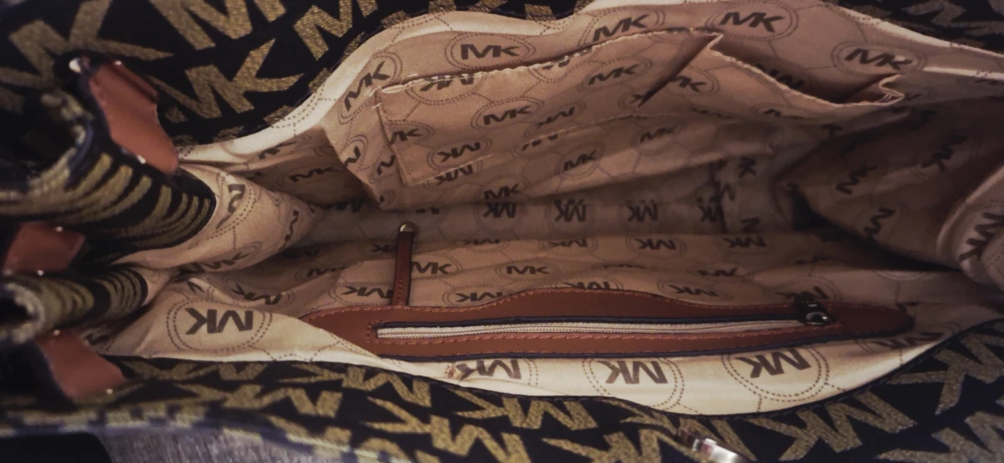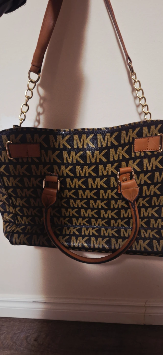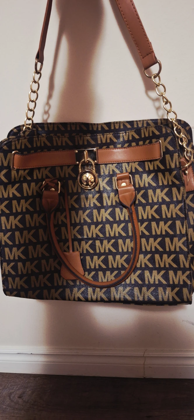 Selling a Michael Kors tote bag. It features the MK logo pattern all over with brown accents. It has a chain and leather strap. It's in great condition!