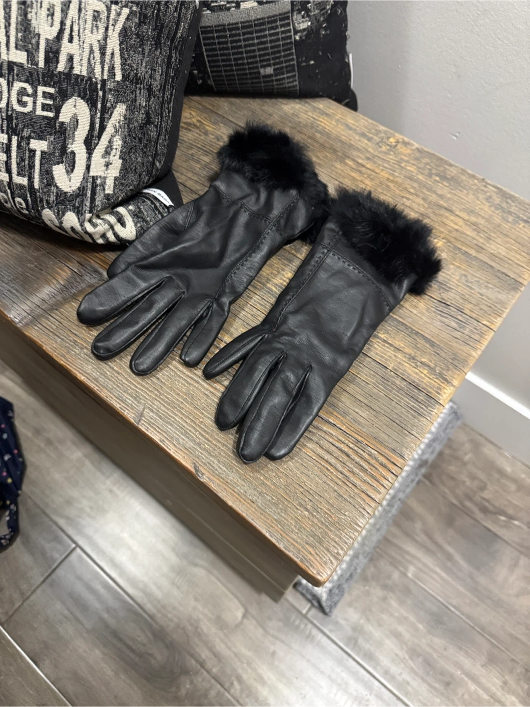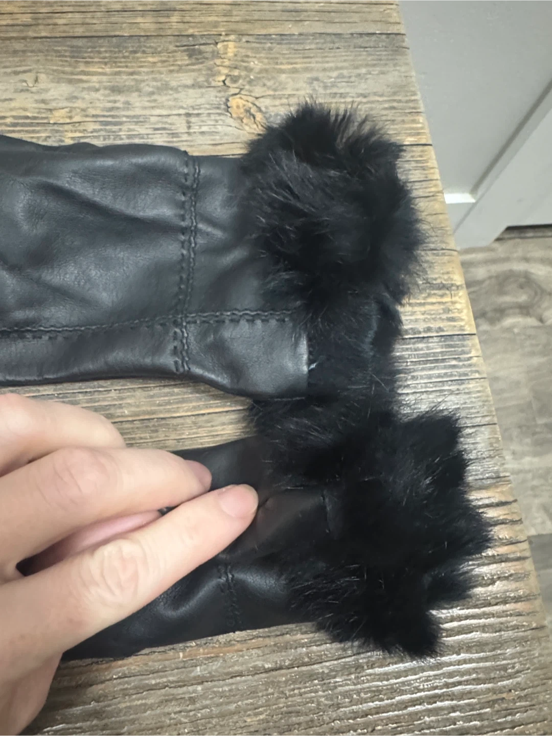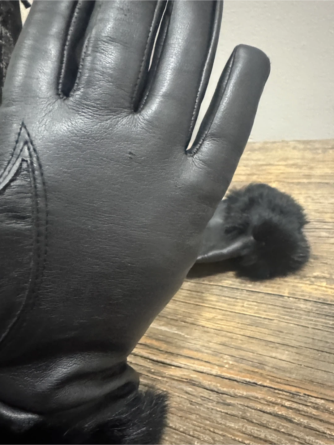 These elegant black leather gloves feature a luxurious fur trim, perfect for adding a touch of sophistication to any outfit. Ideal for keeping warm while staying stylish. Fur sits funny at a part or hem due to storage. Small scratch. Super cute & warm. Insulated