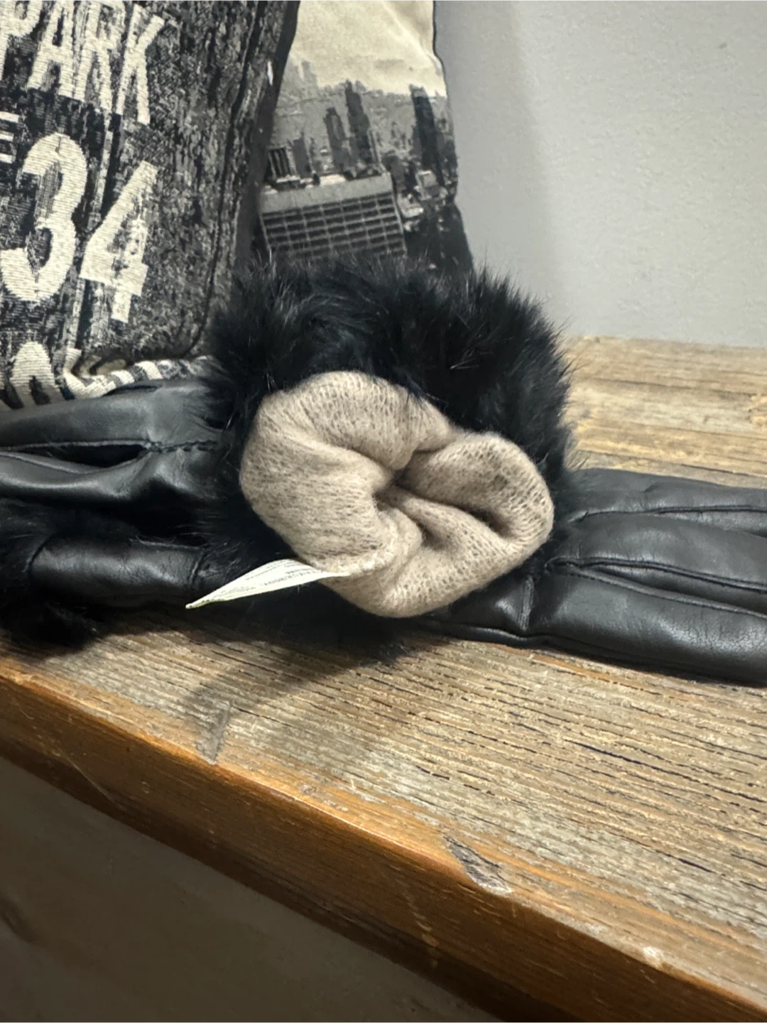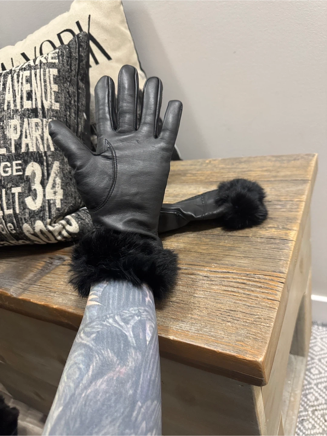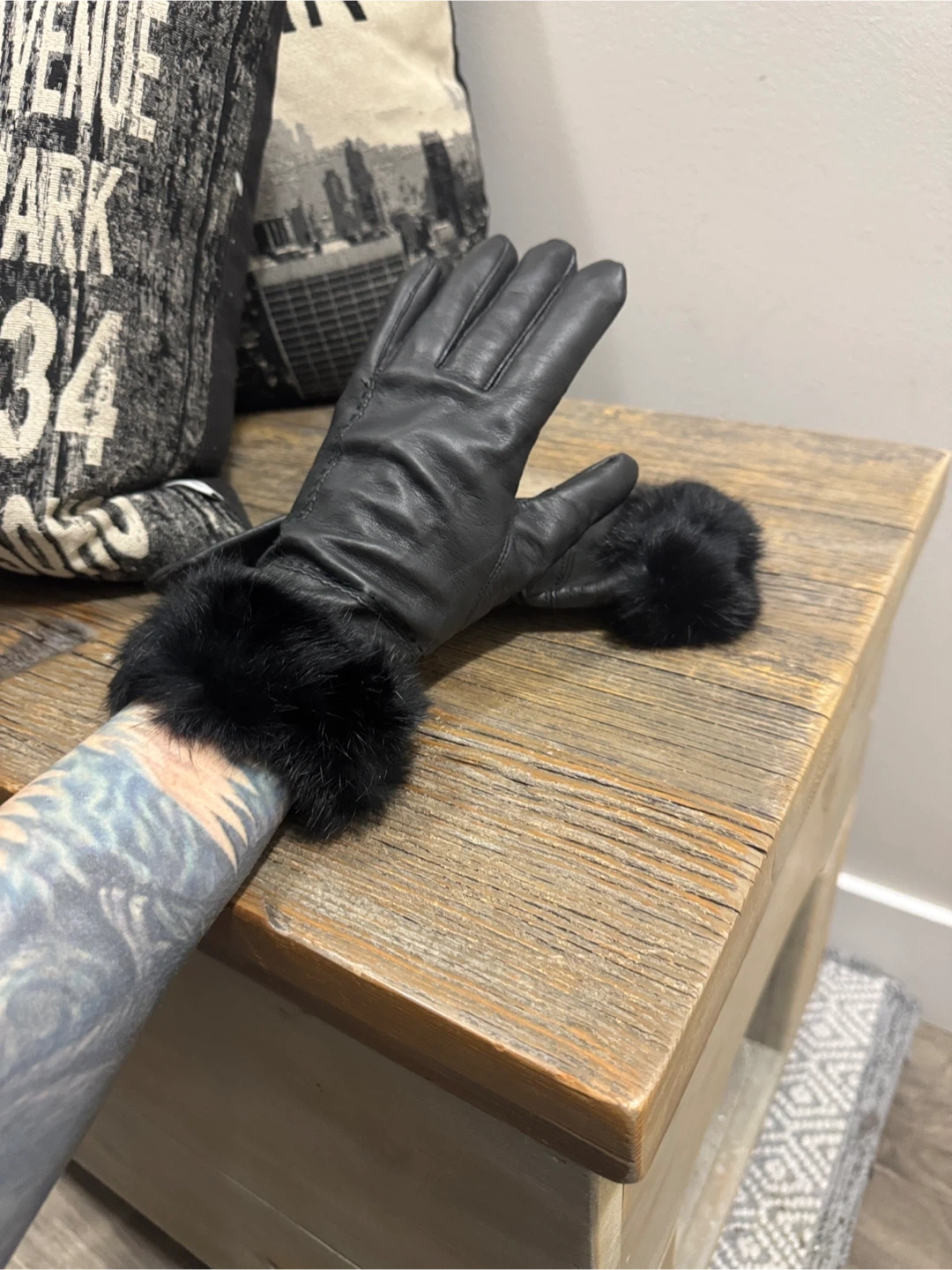 These elegant black leather gloves feature a luxurious fur trim, perfect for adding a touch of sophistication to any outfit. Ideal for keeping warm while staying stylish. Fur sits funny at a part or hem due to storage. Small scratch. Super cute & warm. Insulated
