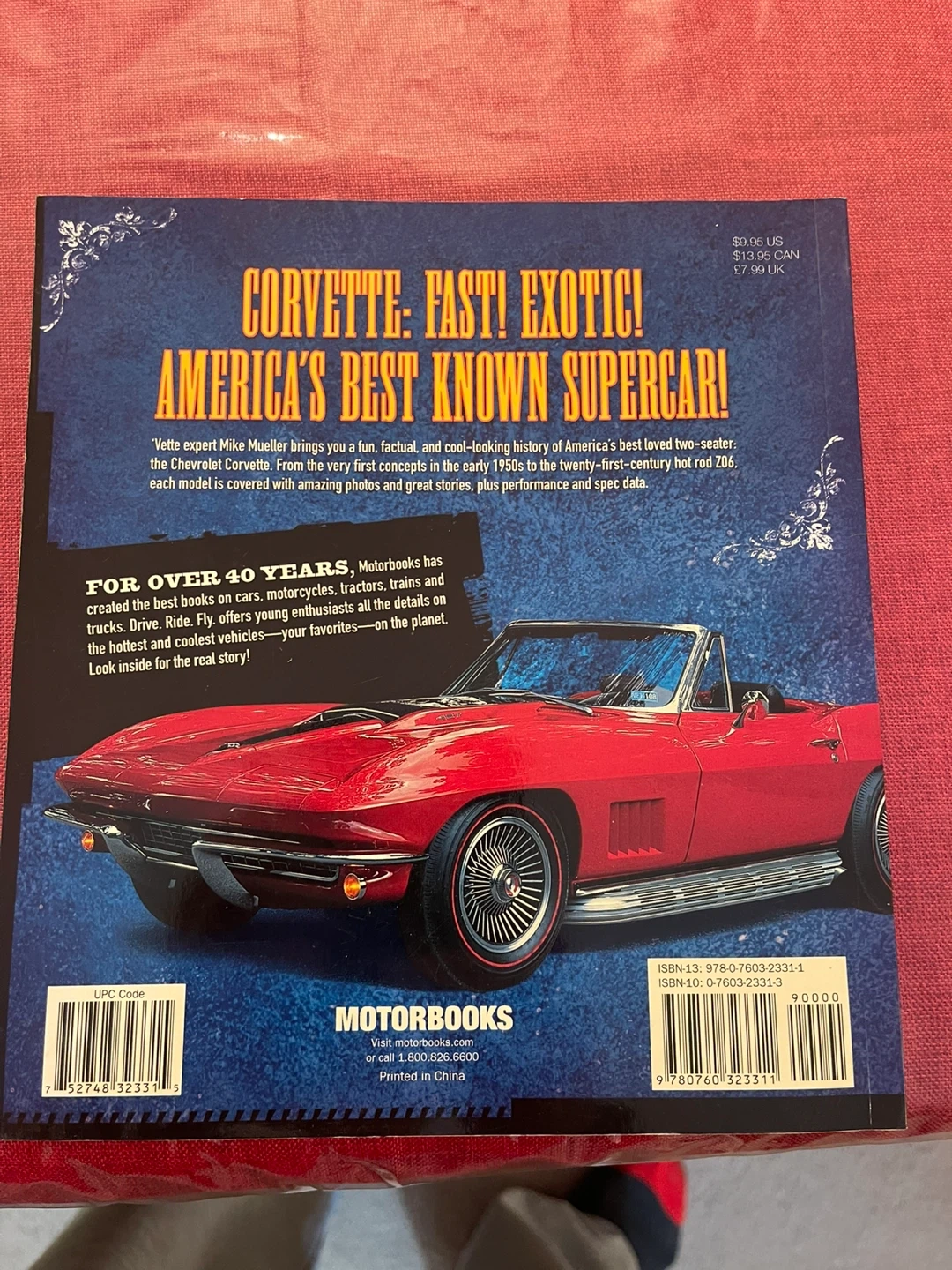 Selling a Corvette book by Mike Mueller with Bob Woods. It explores the history of America's best-loved two-seater, the Chevrolet Corvette, from its early concepts to the twenty-first-century hot rod Z06. The book is filled with photos and great stories, plus performance and spec data. Soft cover. 80 pages. Cash only