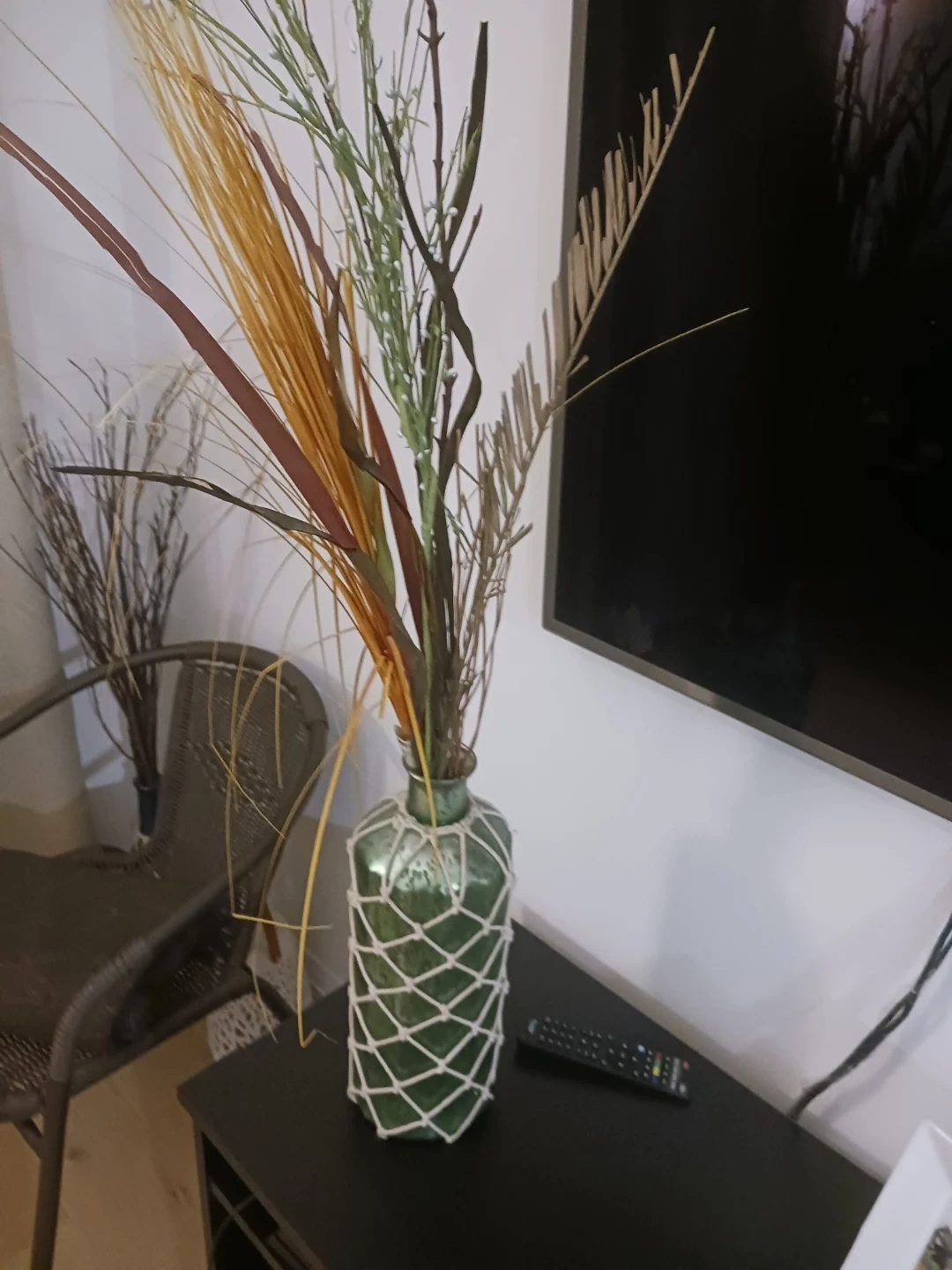 A cute green glass vase with a decorative rope netting around it. Perfect for displaying your favourite flowers or plants! It's in great condition and would look lovely in any room of your home