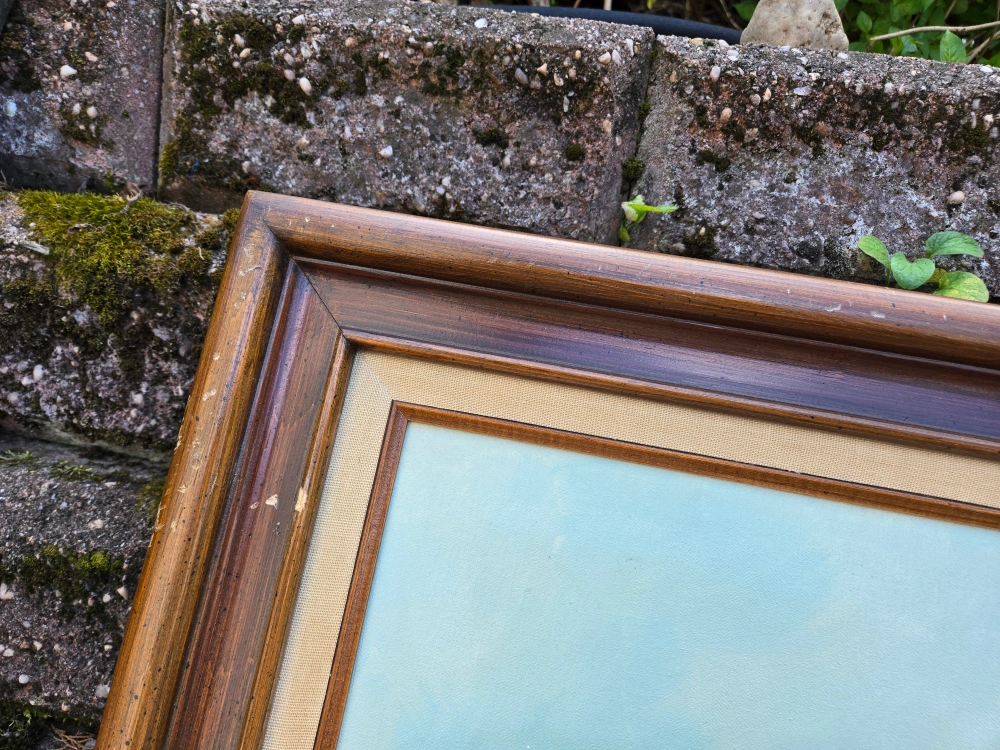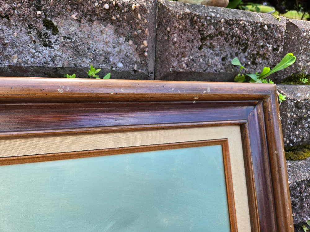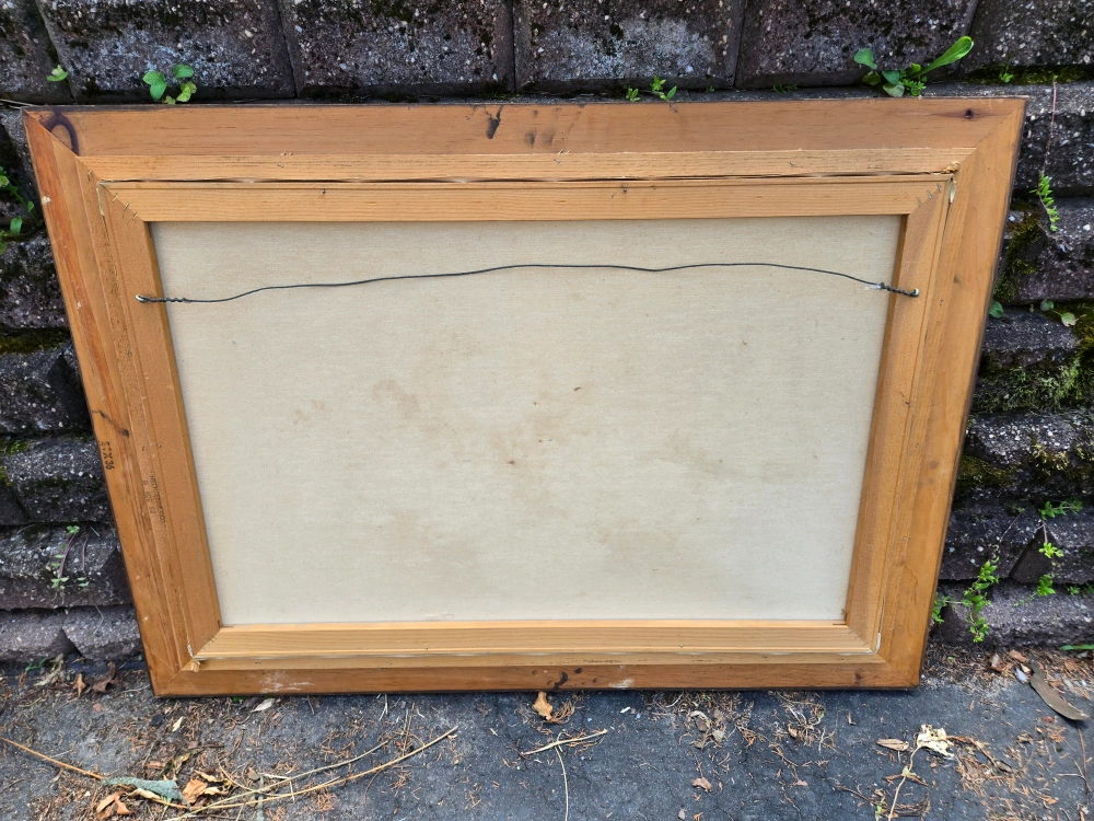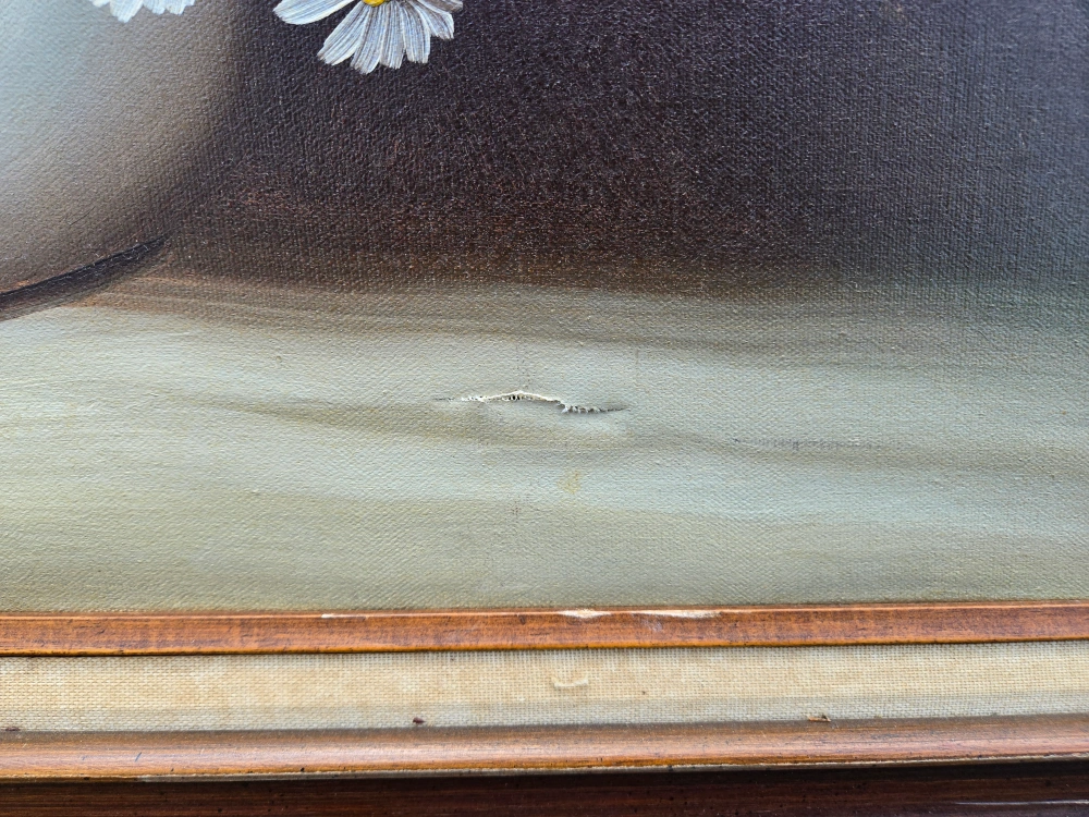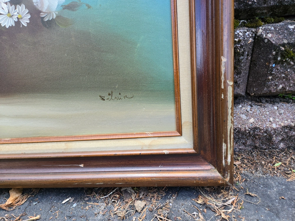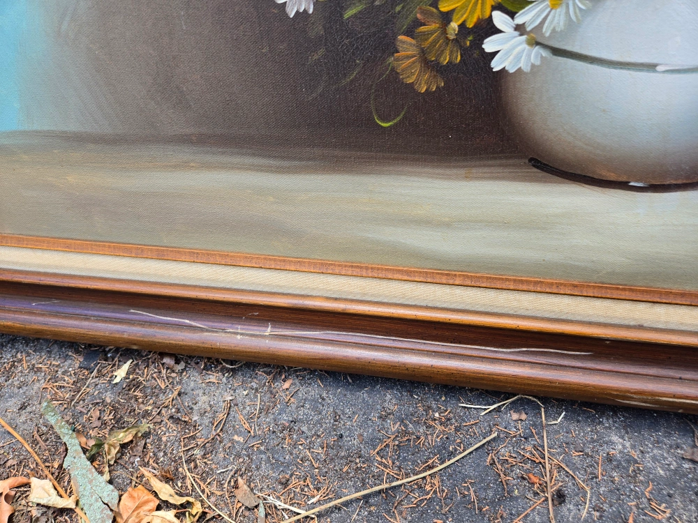 Selling a vintage floral oil painting. The painting features a beautiful arrangement of white, yellow, and red flowers in a vase. There are some signs of wear on the frame, including some scratches and chips, and a small 1in tear on the painting itself.