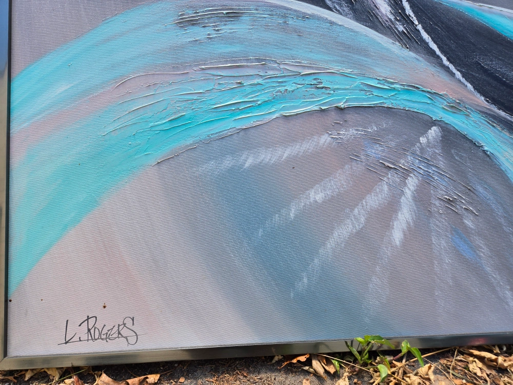 Selling an abstract painting signed by L. Rogers. It features beautiful shades of gray, black, and turquoise. The painting is framed with metal and ready to hang!