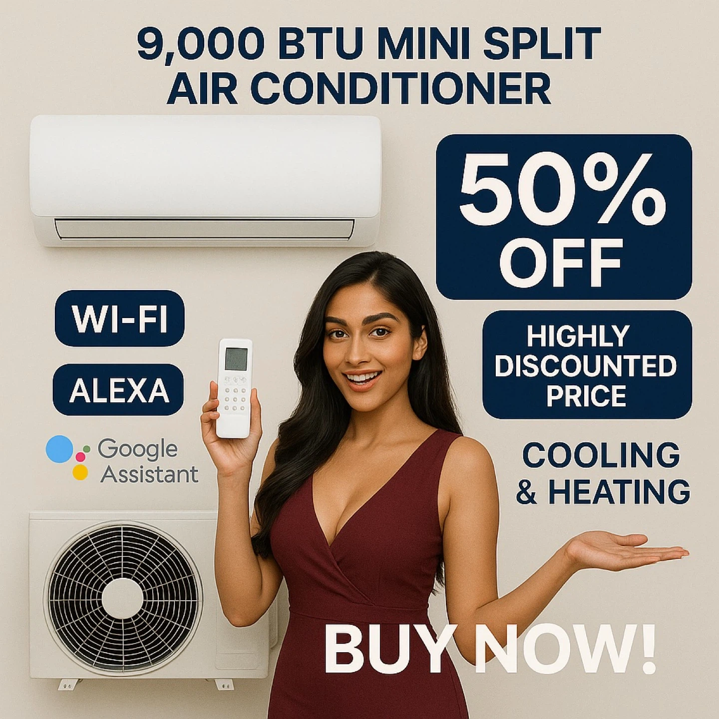 Selling a 9,000 BTU mini split air conditioner. It features both cooling and heating functions. It also supports Wi-Fi, Alexa, and Google Assistant.